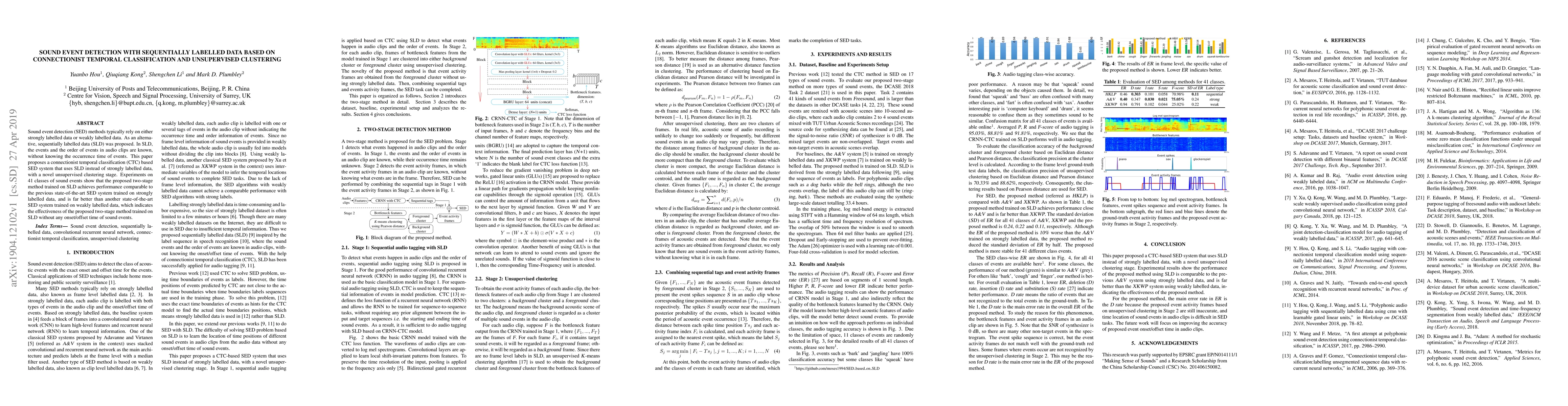 This paper proposes a connectionist temporal classification (CTC) based sound event detection (SED) system using sequentially labelled data (SLD) instead of strongly labelled data, supplemented by an unsupervised clustering stage. Experiments show that this two-stage method achieves performance comparable to systems trained on strongly labelled data, outperforming those trained on weakly labelled data.