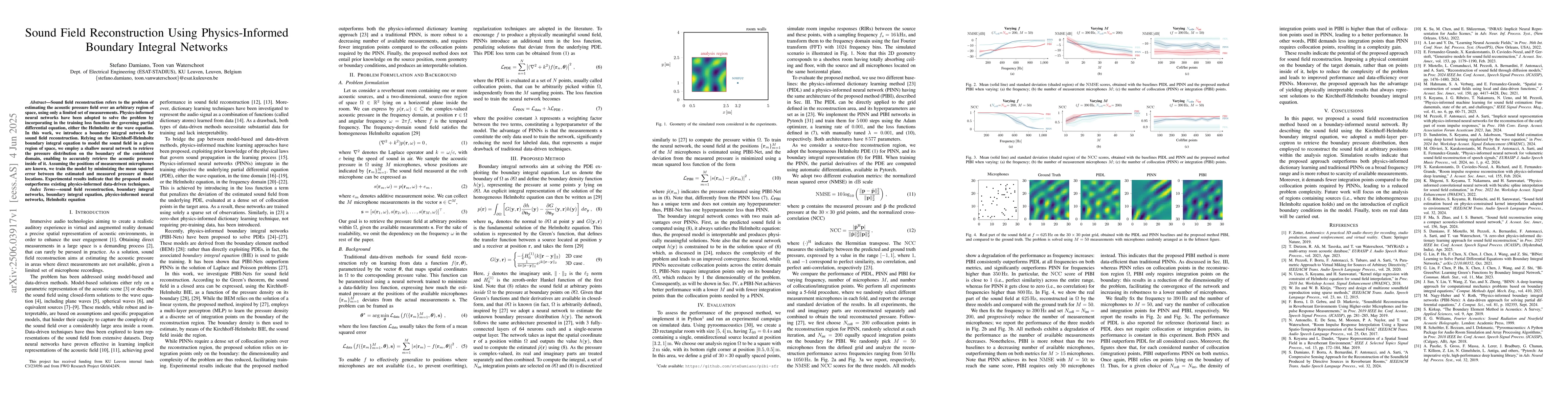 A new neural network model uses boundary integral equations to reconstruct sound fields from limited measurements, outperforming existing physics-informed techniques in experimental results.