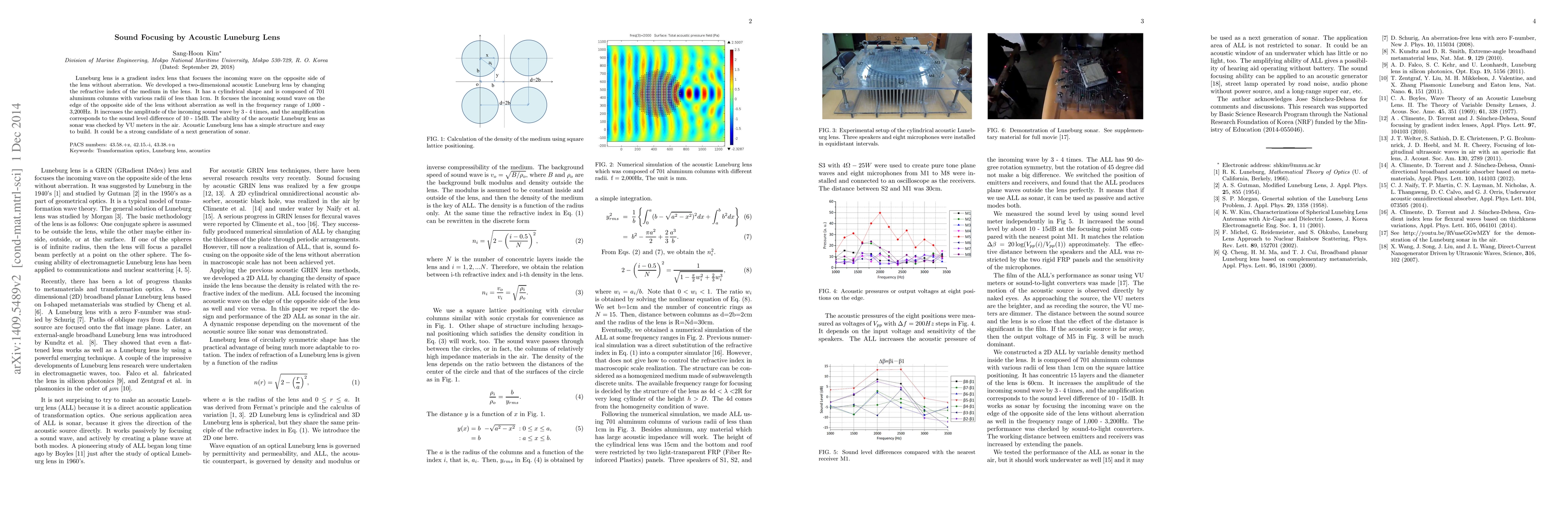 The paper presents a two-dimensional acoustic Luneburg lens made of aluminum columns, which focuses sound waves without aberration in the frequency range of 1,000 - 3,200Hz, amplifying the sound by 3 - 4 times and demonstrating potential for next-generation sonar applications.