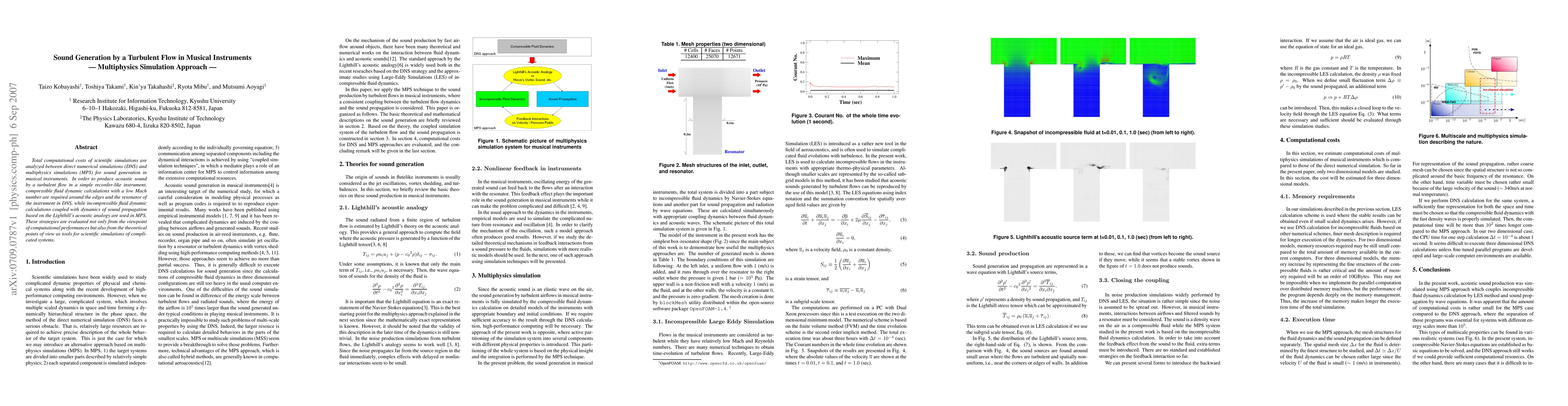 Total computational costs of scientific simulations are analyzed between direct numerical simulations (DNS) and multiphysics simulations (MPS) for sound generation in musical instruments. In order to produce acoustic sound by a turbulent flow in a simple recorder-like instrument, compressible fluid dynamic calculations with a low Mach number are required around the edges and the resonator of the instrument in DNS, while incompressible fluid dynamic calculations coupled with dynamics of sound propagation based on the Lighthill's acoustic analogy are used in MPS. These strategies are evaluated not only from the viewpoint of computational performances but also from the theoretical points of view as tools for scientific simulations of complicated systems.