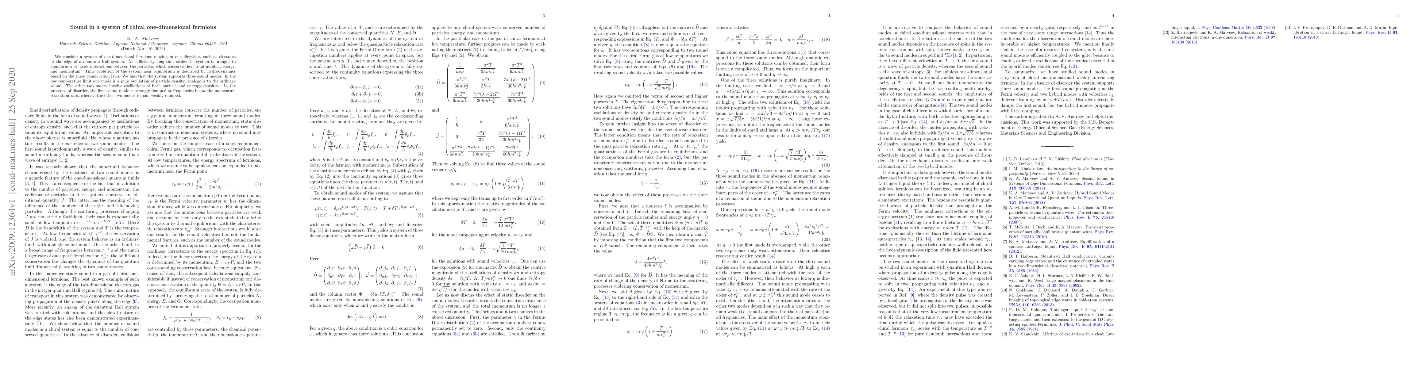 We consider a system of one-dimensional fermions moving in one direction, such as electrons at the edge of a quantum Hall system. At sufficiently long time scales the system is brought to equilibrium by weak interactions between the particles, which conserve their total number, energy, and momentum. Time evolution of the system near equilibrium is described by hydrodynamics based on the three conservation laws. We find that the system supports three sound modes. In the low temperature limit one mode is a pure oscillation of particle density, analogous to the ordinary sound. The other two modes involve oscillations of both particle and entropy densities. In the presence of disorder, the first sound mode is strongly damped at frequencies below the momentum relaxation rate, whereas the other two modes remain weakly damped.