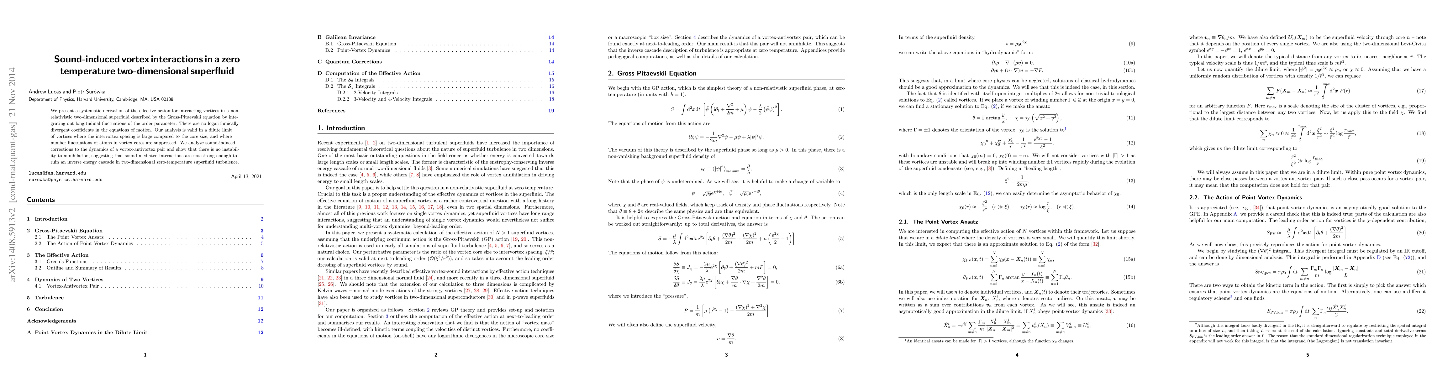 We present a systematic derivation of the effective action for interacting vortices in a non-relativistic two-dimensional superfluid described by the Gross-Pitaevskii equation by integrating out longitudinal fluctuations of the order parameter. There are no logarithmically divergent coefficients in the equations of motion. Our analysis is valid in a dilute limit of vortices where the intervortex spacing is large compared to the core size, and where number fluctuations of atoms in vortex cores are suppressed. We analyze sound-induced corrections to the dynamics of a vortex-antivortex pair and show that there is no instability to annihilation, suggesting that sound-mediated interactions are not strong enough to ruin an inverse energy cascade in two-dimensional zero-temperature superfluid turbulence.