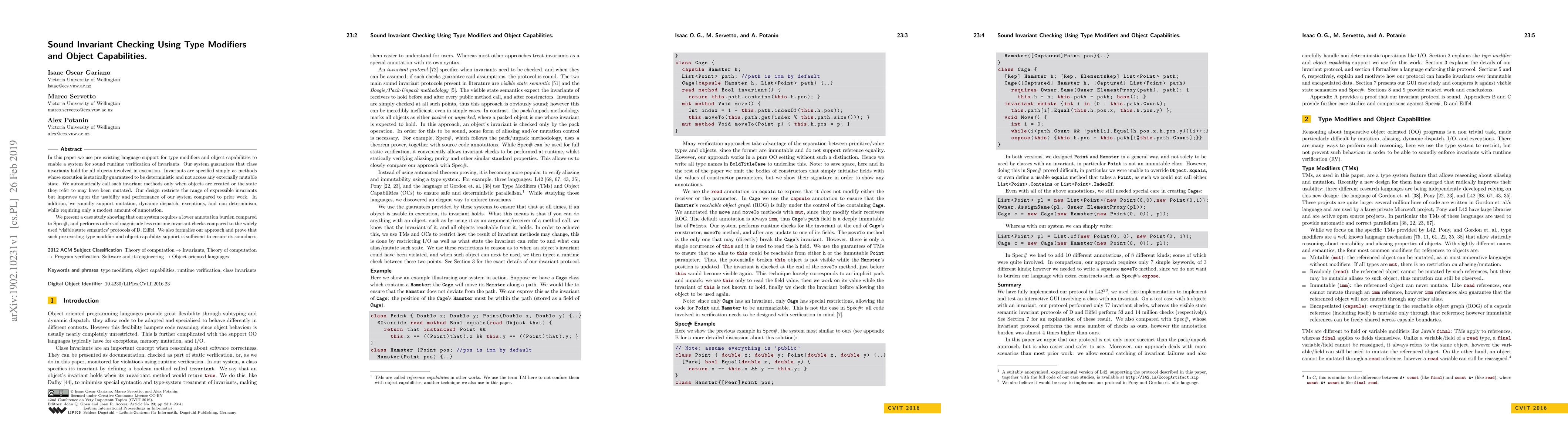 In this paper we use pre existing language support for type modifiers and object capabilities to enable a system for sound runtime verification of invariants. Our system guarantees that class invariants hold for all objects involved in execution. Invariants are specified simply as methods whose execution is statically guaranteed to be deterministic and not access any externally mutable state. We automatically call such invariant methods only when objects are created or the state they refer to may have been mutated. Our design restricts the range of expressible invariants but improves upon the usability and performance of our system compared to prior work. In addition, we soundly support mutation, dynamic dispatch, exceptions, and non determinism, while requiring only a modest amount of annotation. We present a case study showing that our system requires a lower annotation burden compared to Spec#, and performs orders of magnitude less runtime invariant checks compared to the widely used `visible state semantics' protocols of D, Eiffel. We also formalise our approach and prove that such pre existing type modifier and object capability support is sufficient to ensure its soundness.