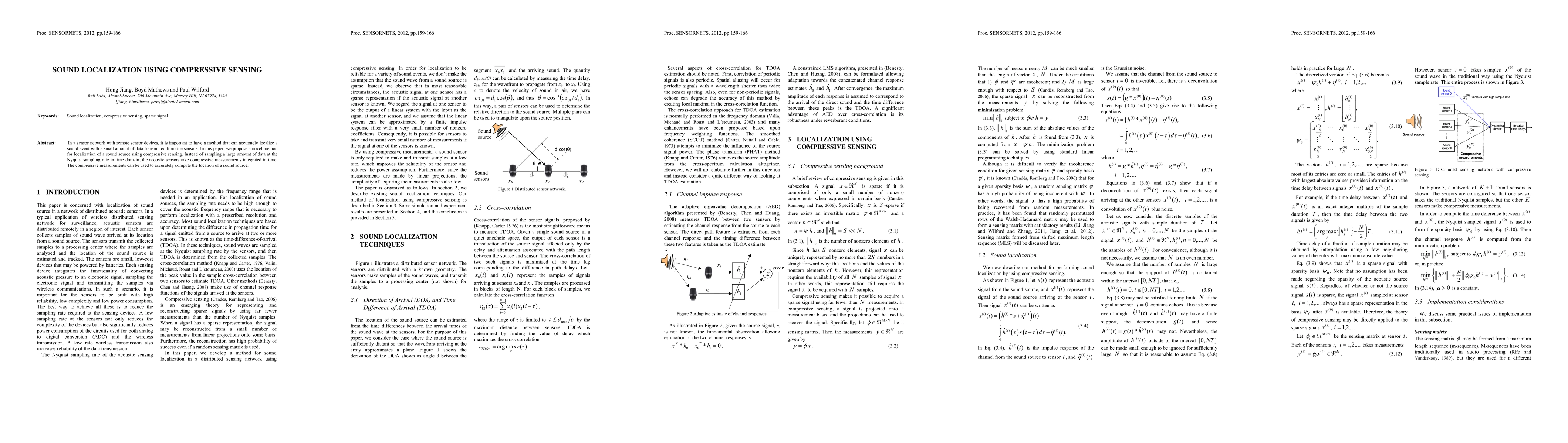 This paper proposes a novel method for sound source localization using compressive sensing in a sensor network, enabling accurate localization with minimal data transmission by taking compressive measurements instead of full Nyquist sampling.