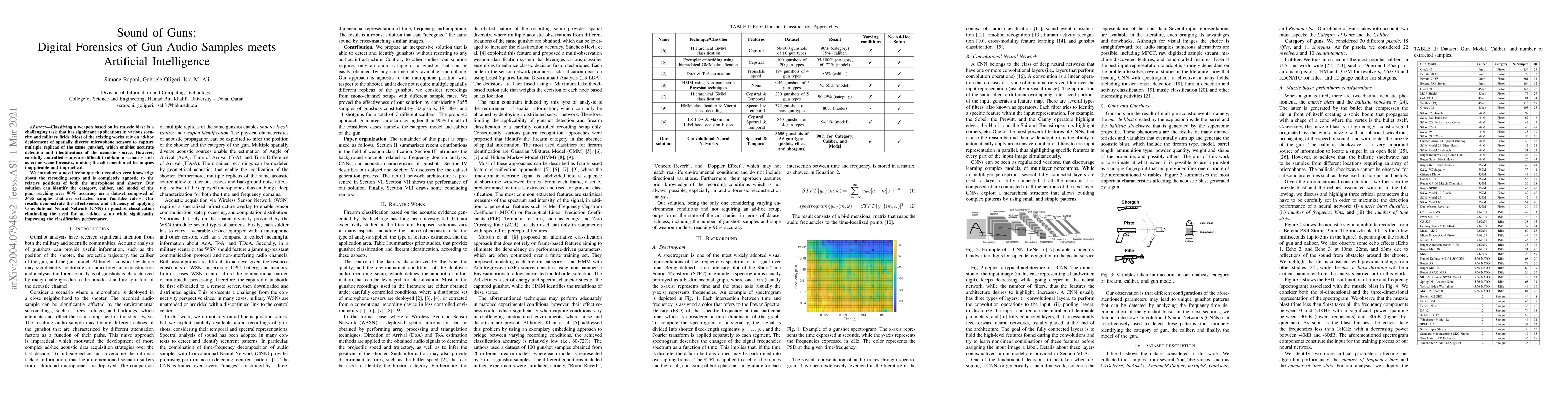 This paper presents a novel digital forensics technique using Convolutional Neural Networks (CNN) to classify gun audio samples based on muzzle blast, achieving over 90% accuracy without requiring knowledge of the recording setup or microphone positions. The method is effective for practical applications in security and crime scene forensics.