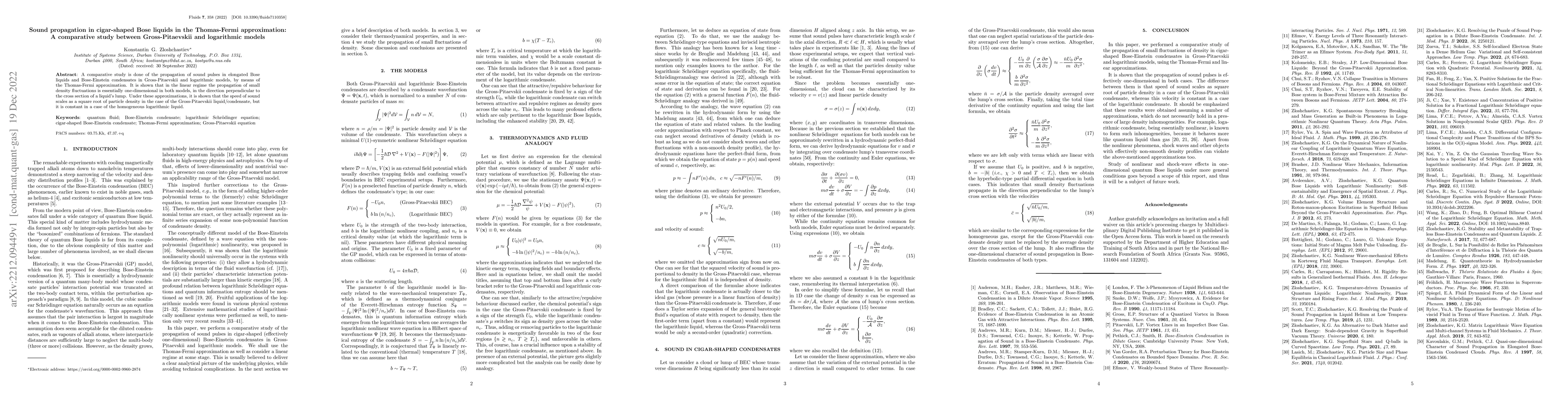 A comparative study is done of the propagation of sound pulses in elongated Bose liquids and Bose-Einstein condensates in Gross-Pitaevskii and logarithmic models, by means of the Thomas-Fermi approximation. It is shown that in the linear regime the propagation of small density fluctuations is essentially one-dimensional in both models, in the direction perpendicular to the cross section of a liquid's lump. Under these approximations, it is shown that the speed of sound scales as a square root of particle density in the case of the Gross-Pitaevskii liquid/condensate, but it is constant in a case of the homogeneous logarithmic liquid.
