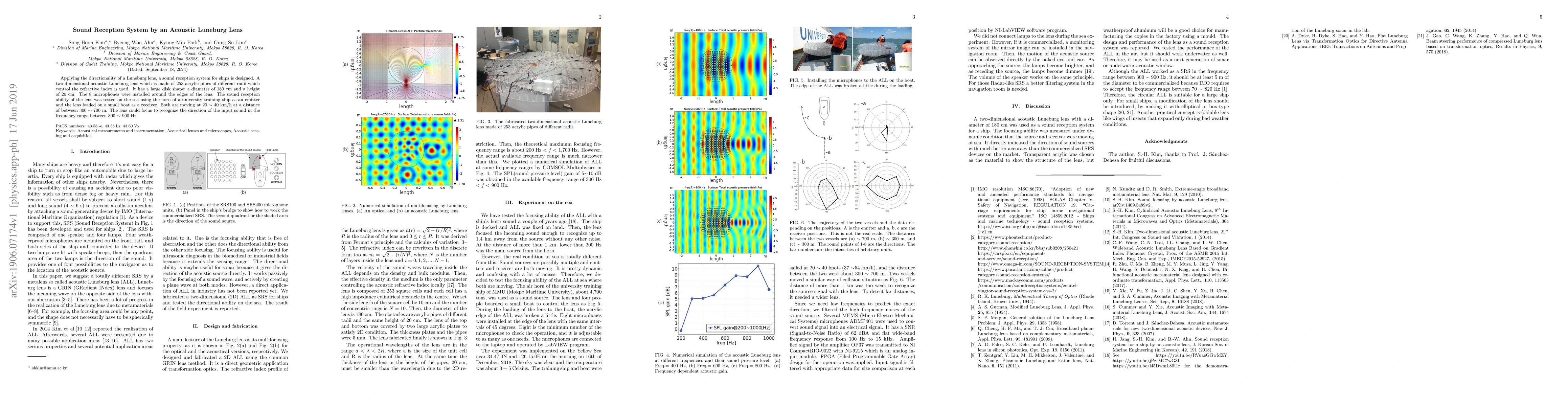 This research developed a sound reception system for ships using a two-dimensional acoustic Luneburg lens made of 253 acrylic pipes. The lens focused sound in the 300-900 Hz range, demonstrating its ability to recognize sound directionality over distances of 300-700 meters on the sea.