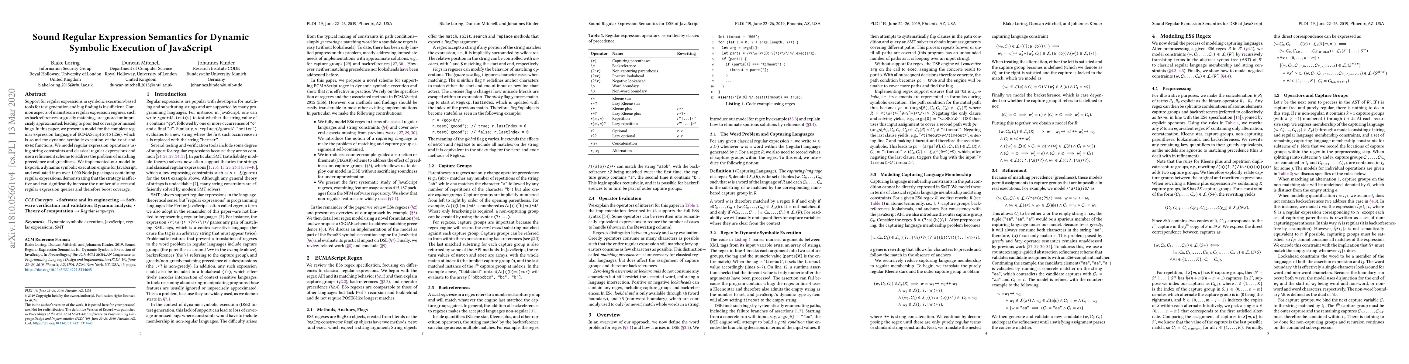 This paper introduces a comprehensive strategy for accurately reasoning about regular expressions in symbolic execution of JavaScript, addressing issues like backreferences and greedy matching. The authors implemented their model in a dynamic symbolic execution engine, showing a 30% increase in line coverage for tested Node.js packages.