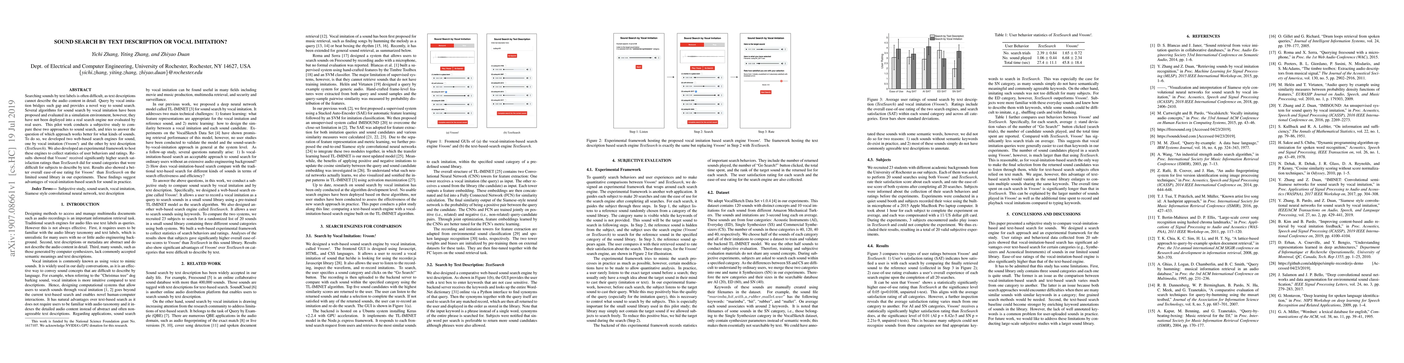 This study compares sound search by vocal imitation versus text description, finding that vocal imitation (Vroom!) significantly outperforms text search (TextSearch) in user satisfaction and ease-of-use, especially for sounds difficult to describe textually. The results suggest vocal imitation is a more effective approach for practical sound search applications.