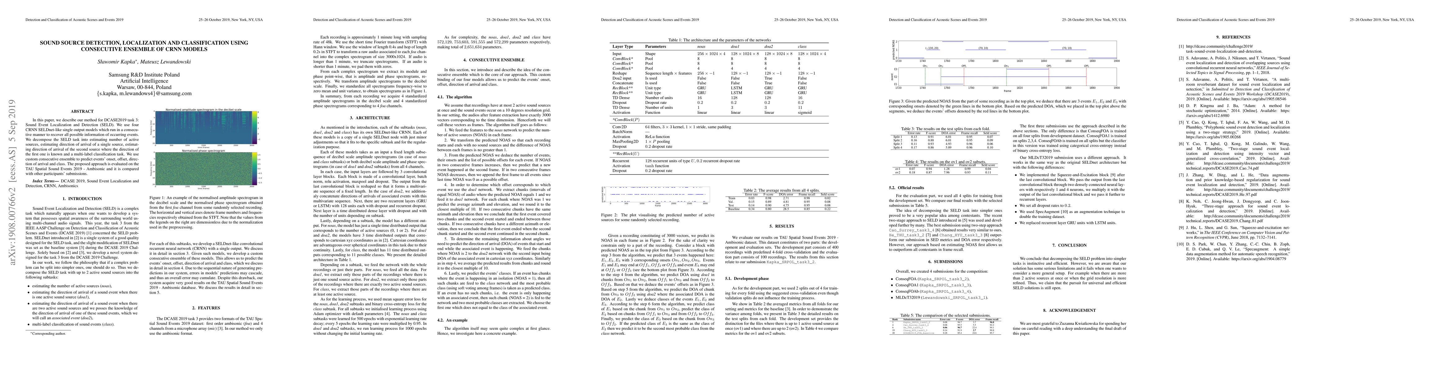 This paper proposes a method for sound event localization and detection using a consecutive ensemble of four CRNN models, decomposing the task into source count, direction of arrival estimation, and multi-label classification. The approach is evaluated on the TAU Spatial Sound Events 2019 dataset and compared with other submissions.