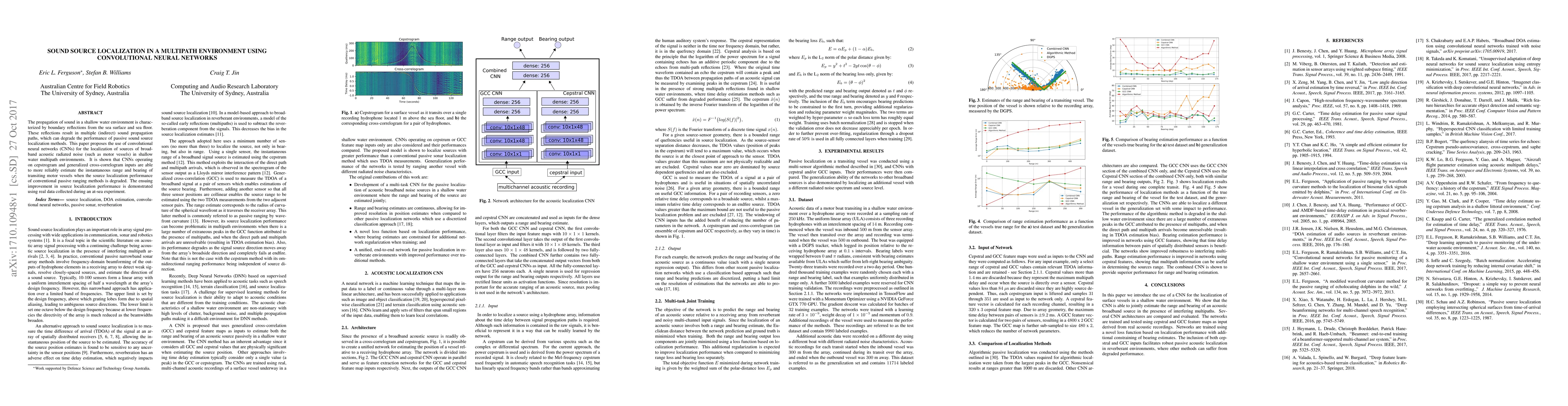 This paper proposes using convolutional neural networks (CNNs) to localize broadband acoustic sources in shallow water, where conventional methods struggle due to multipath reflections. CNNs trained on cepstrogram and generalized cross-correlogram inputs show improved performance in estimating the range and bearing of motor vessels.