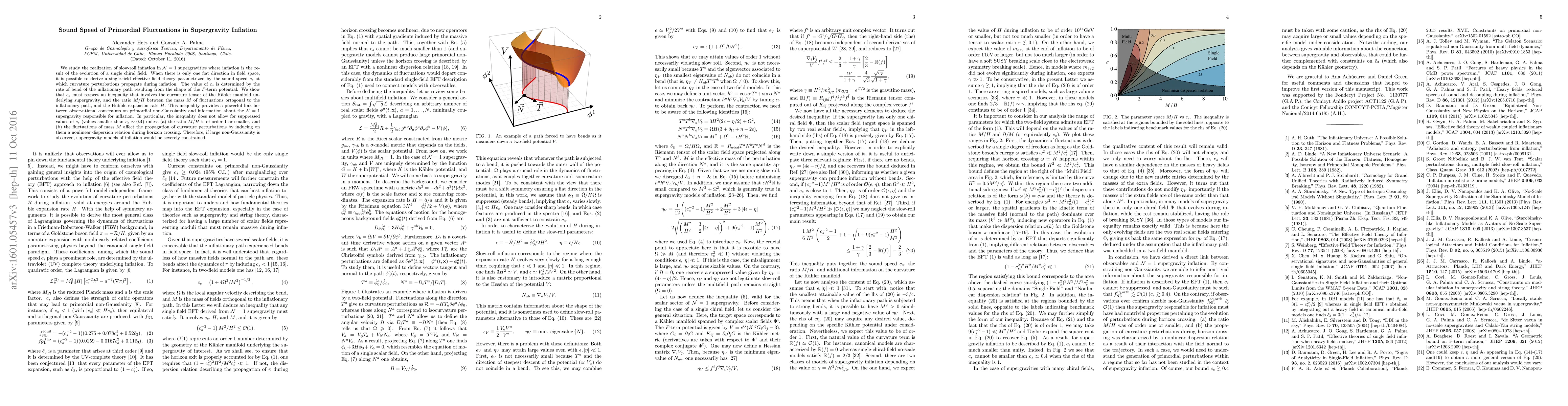 This paper investigates slow-roll inflation in $\mathcal N = 1$ supergravity, focusing on the sound speed $c_s$ of primordial fluctuations. It establishes an inequality linking $c_s$ to the curvature tensor and the ratio $M/H$, constraining models with large non-Gaussianity and suggesting that suppressed $c_s$ values require specific conditions on $M/H$ and nonlinear dispersion relations.