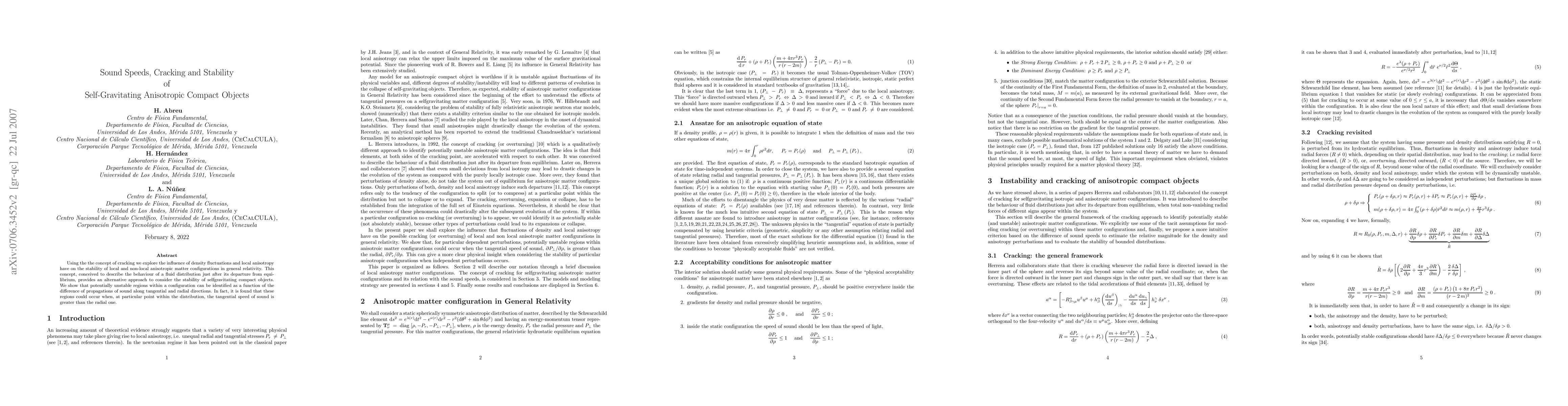 This paper investigates the stability of self-gravitating anisotropic compact objects using the concept of "cracking," which examines density fluctuations and local anisotropy. It finds that unstable regions can be identified by comparing the tangential and radial speeds of sound, with instability arising when the tangential speed exceeds the radial speed.