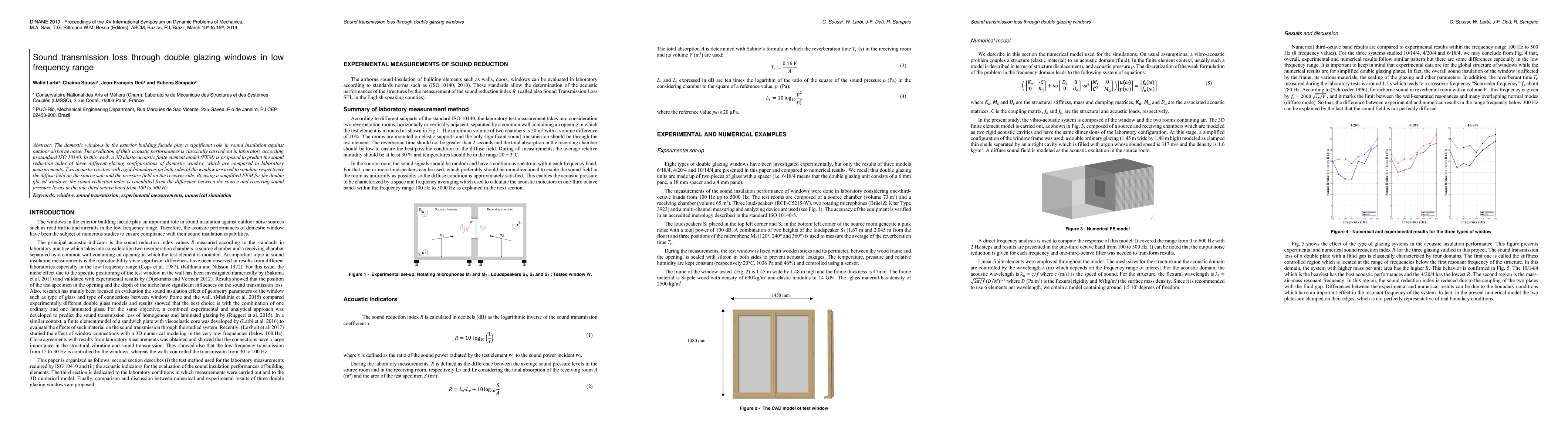 This paper proposes a 3D elasto-acoustic finite element model to predict the sound reduction index of three different double glazing configurations in the low frequency range (100-500 Hz). The model's predictions are compared to laboratory measurements, highlighting the role of domestic windows in sound insulation against outdoor noise.