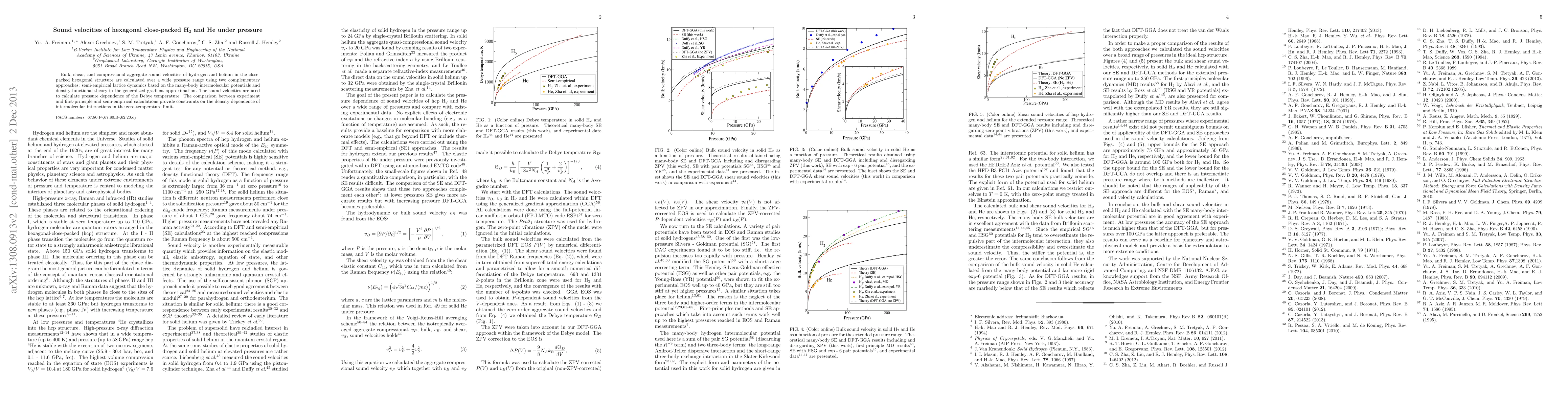 Bulk, shear, and compressional aggregate sound velocities of hydrogen and helium in the close- packed hexagonal structure are calculated over a wide pressure range using two complementary approaches: semi-empirical lattice dynamics based on the many-body intermolecular potentials and density-functional theory in the generalized gradient approximation. The sound velocities are used to calculate pressure dependence of the Debye temperature. The comparison between experiment and first-principle and semi-empirical calculations provide constraints on the density dependence of intermolecular interactions in the zero-temperature limit.