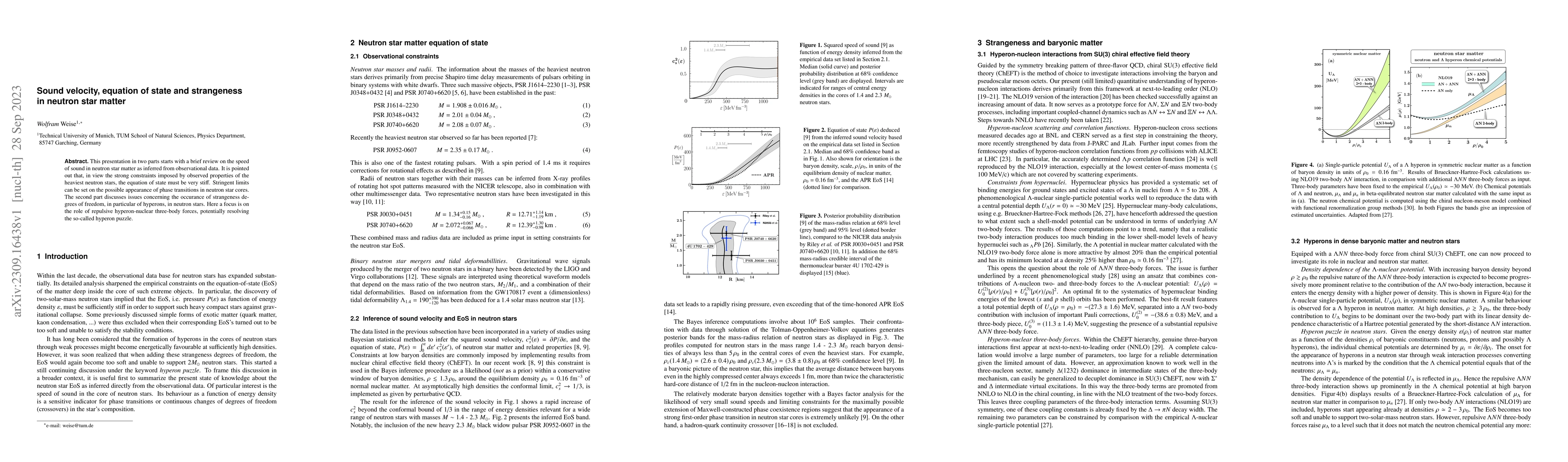 This paper reviews the speed of sound in neutron star matter, emphasizing the stiff equation of state required by observational data, and discusses the implications of hyperon-nuclear three-body forces on the potential appearance of strangeness in neutron stars.