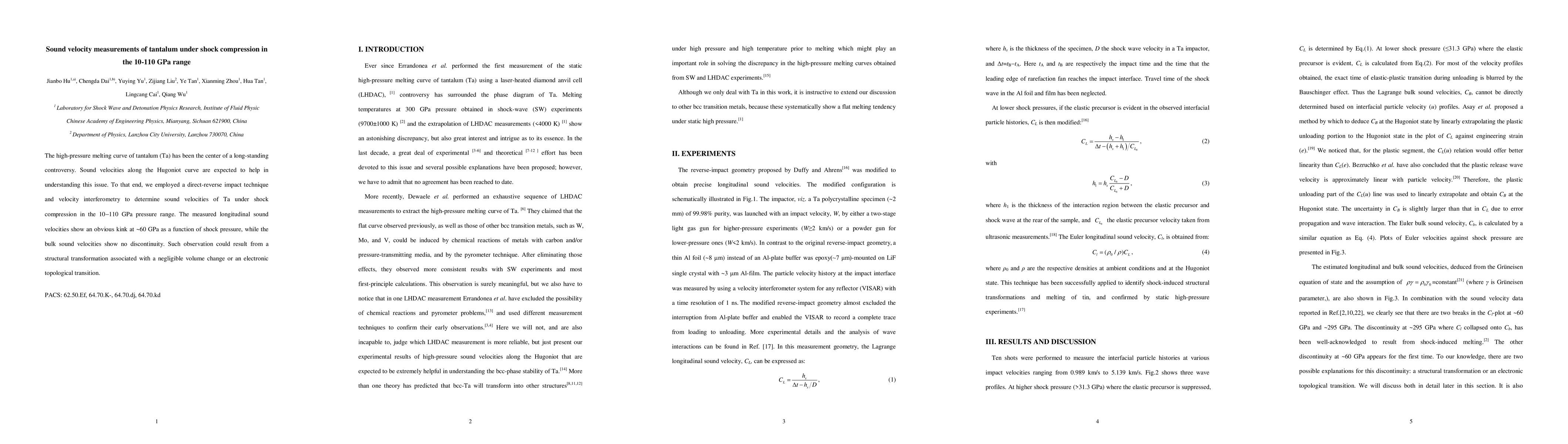 This study measures tantalum's sound velocities under shock compression between 10-110 GPa, revealing a kink in longitudinal velocities at ~60 GPa, suggesting a possible structural transformation or electronic transition, while bulk velocities remain continuous.