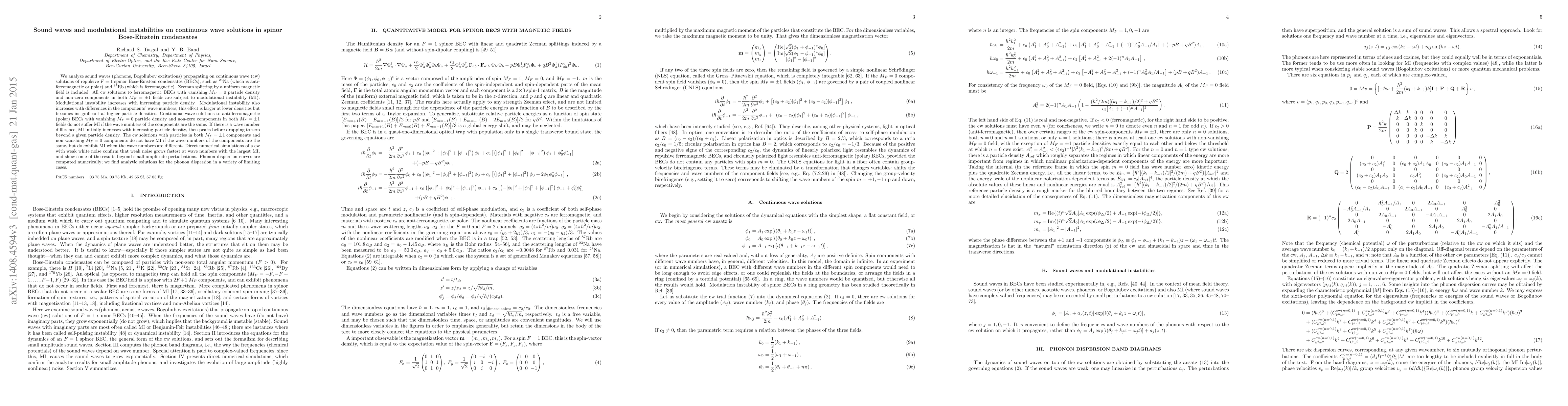 We analyze sound waves (phonons, Bogoliubov excitations) propagating on continuous wave (cw) solutions of repulsive $F=1$ spinor Bose-Einstein condensates (BECs), such as $^{23}$Na (which is antiferromagnetic or polar) and $^{87}$Rb (which is ferromagnetic). Zeeman splitting by a uniform magnetic field is included. All cw solutions to ferromagnetic BECs with vanishing $M_F=0$ particle density and non-zero components in both $M_F=\pm 1$ fields are subject to modulational instability (MI). MI increases with increasing particle density. MI also increases with differences in the components' wavenumbers; this effect is larger at lower densities but becomes insignificant at higher particle densities. CW solutions to antiferromagnetic (polar) BECS with vanishing $M_F=0$ particle density and non-zero components in both $M_F=\pm 1$ fields do not suffer MI if the wavenumbers of the components are the same. If there is a wavenumber difference, MI initially increases with increasing particle density, then peaks before dropping to zero beyond a given particle density. The cw solutions with particles in both $M_F=\pm 1$ components and nonvanishing $M_F=0$ components do not have MI if the wavenumbers of the components are the same, but do exhibit MI when the wavenumbers are different. Direct numerical simulations of a cw with weak white noise confirm that weak noise grows fastest at wavenumbers with the largest MI, and shows some of the results beyond small amplitude perturbations. Phonon dispersion curves are computed numerically; we find analytic solutions for the phonon dispersion in a variety of limiting cases.
