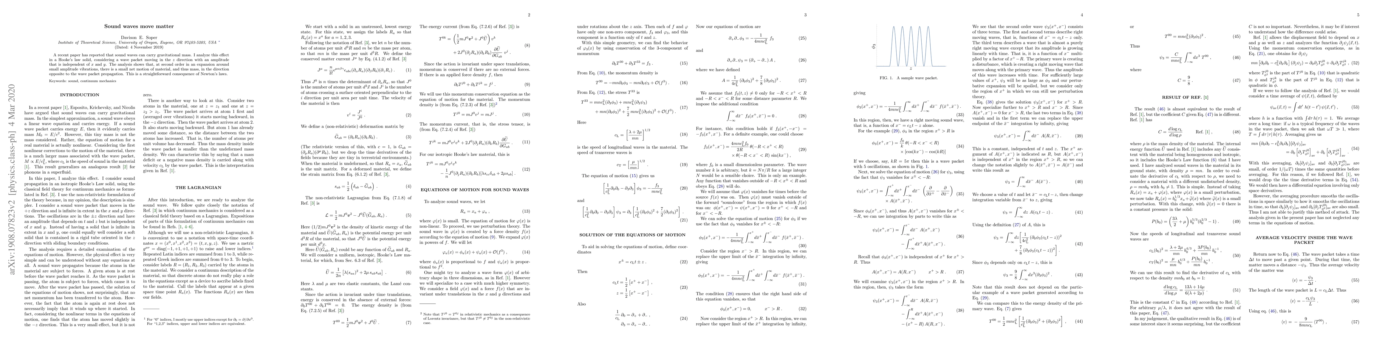 A recent Letter has reported that sound waves can carry gravitational mass. I analyze this effect in a Hooke's law solid, considering a wave packet moving in the $z$ direction with an amplitude that is independent of $x$ and $y$. The analysis shows that, at second order in an expansion around small amplitude vibrations, there is a small net motion of material, and thus mass, in the direction opposite to the wave packet propagation. This is a straightforward consequence of Newton's laws.