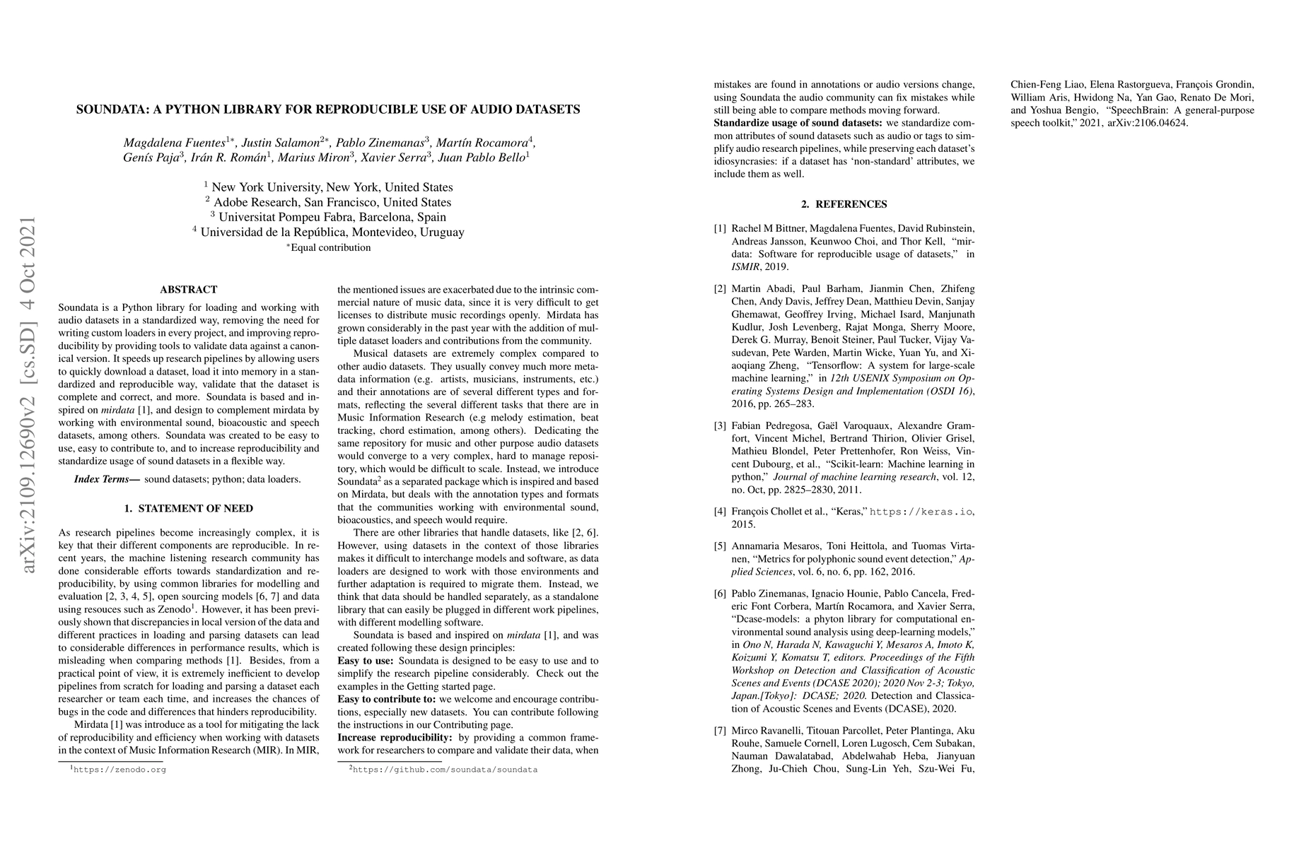 Soundata is a Python library designed to standardize and enhance reproducibility in handling audio datasets, facilitating quick dataset downloads, loading, and validation. It complements existing libraries by supporting environmental sound, bioacoustic, and speech datasets.