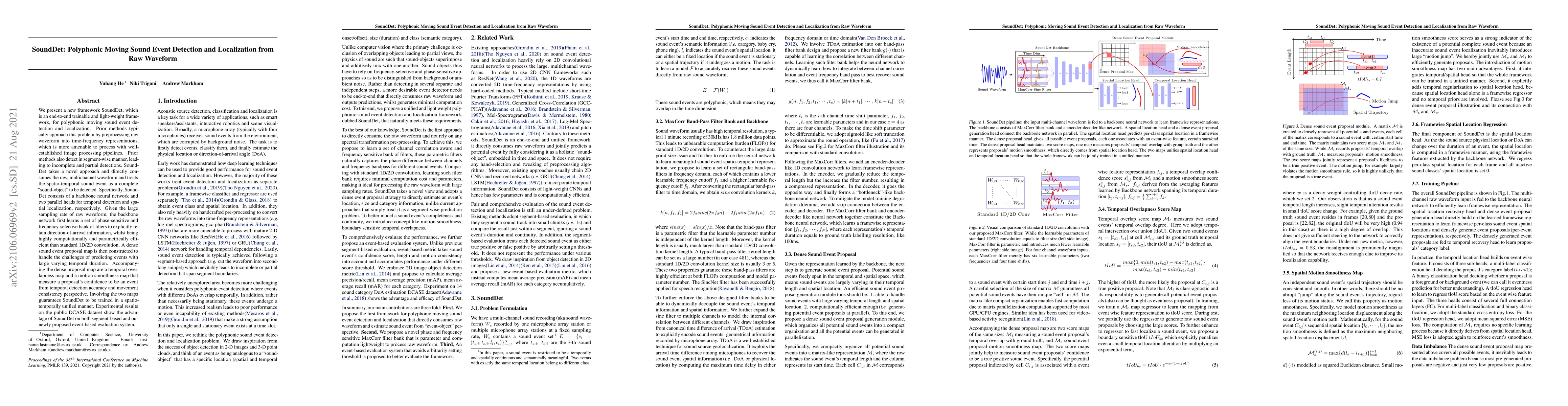 SoundDet is an end-to-end trainable framework for polyphonic moving sound event detection and localization directly from raw waveforms, avoiding preprocessing. It uses a neural network with parallel heads for temporal detection and spatial localization, achieving better performance than segment-wise methods.