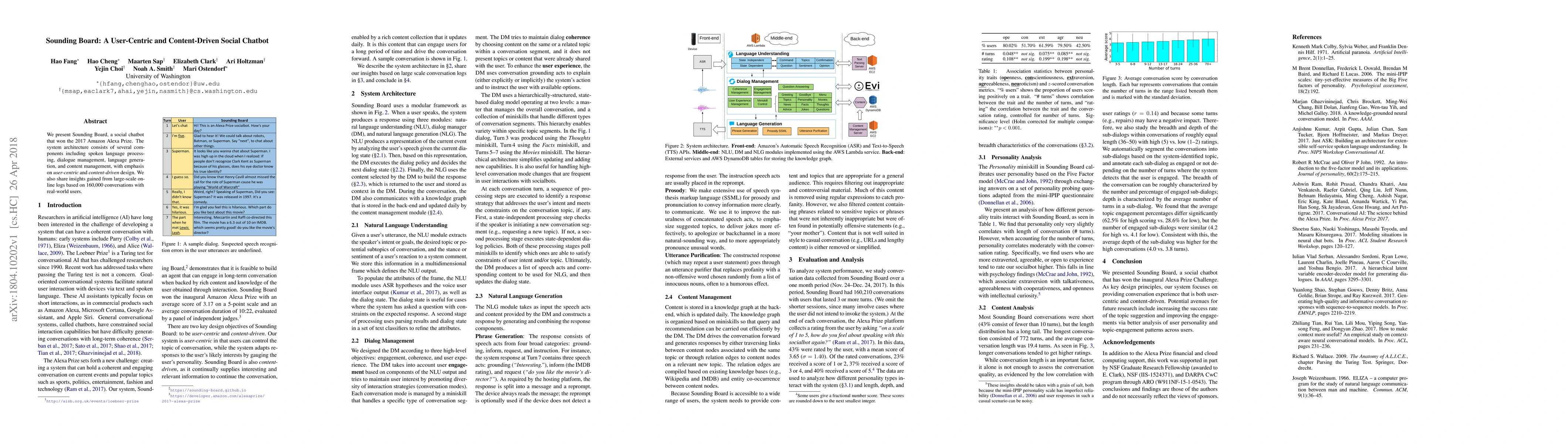 Sounding Board is a social chatbot that won the 2017 Amazon Alexa Prize, featuring a user-centric and content-driven architecture. Insights from 160,000 real-world conversations reveal valuable usage patterns and user interactions.