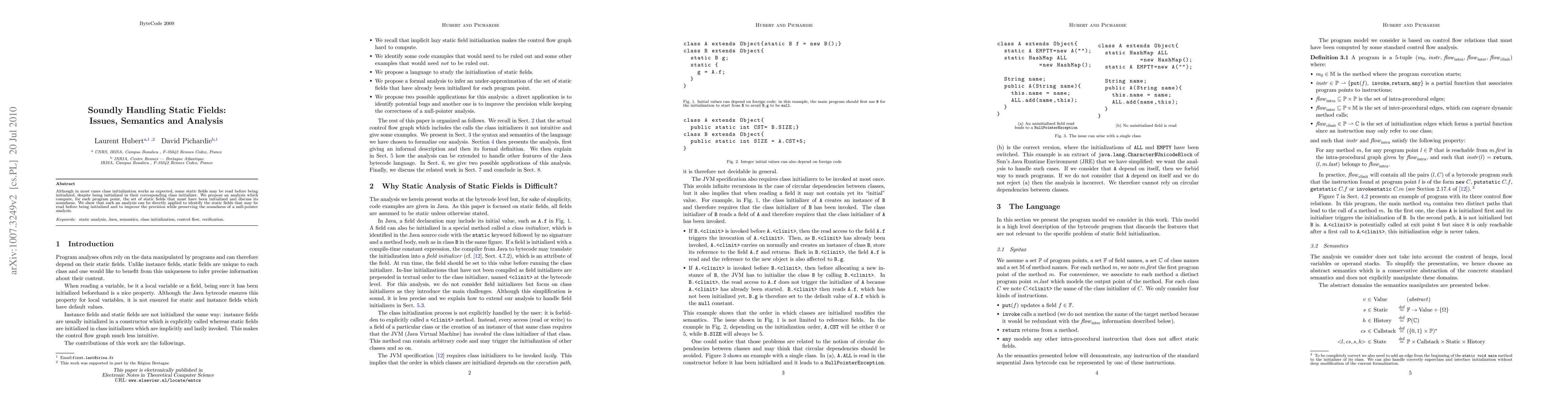 Although in most cases class initialization works as expected, some static fields may be read before being initialized, despite being initialized in their corresponding class initializer. We propose an analysis which compute, for each program point, the set of static fields that must have been initialized and discuss its soundness. We show that such an analysis can be directly applied to identify the static fields that may be read before being initialized and to improve the precision while preserving the soundness of a null-pointer analysis.