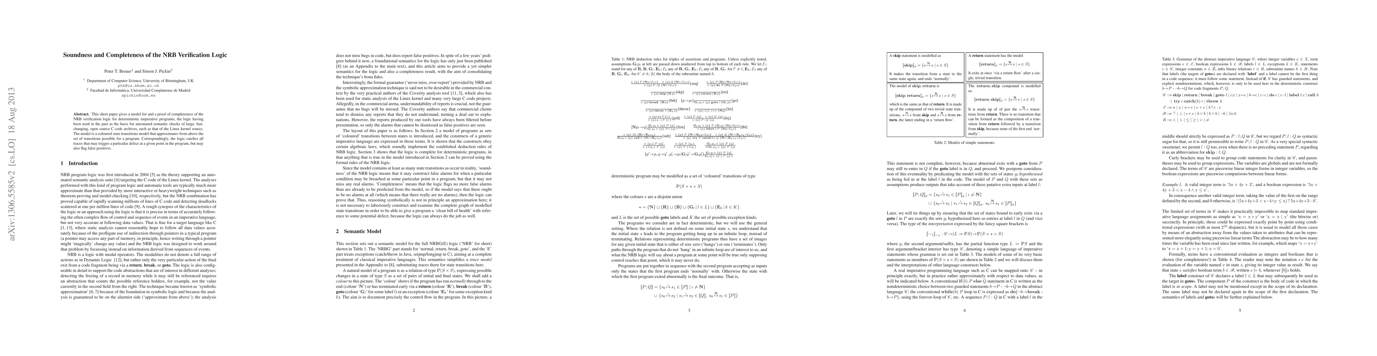 This short paper gives a model for and a proof of completeness of the NRB verification logic for deterministic imperative programs, the logic having been used in the past as the basis for automated semantic checks of large, fast-changing, open source C code archives, such as that of the Linux kernel source. The model is a colored state transitions model that approximates from above the set of transitions possible for a program. Correspondingly, the logic catches all traces that may trigger a particular defect at a given point in the program, but may also flag false positives.