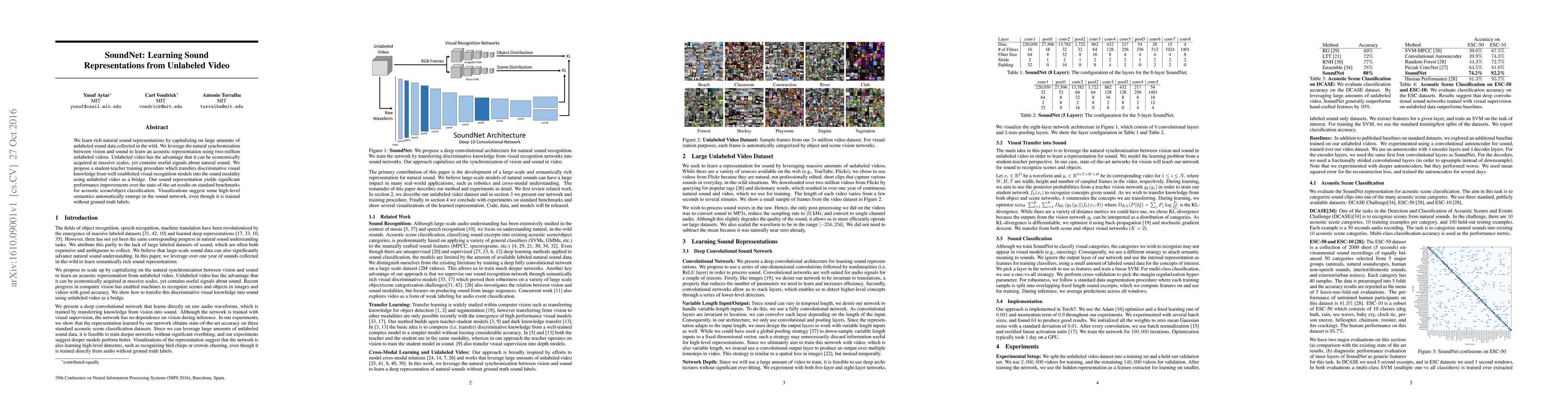 The paper introduces SoundNet, a method to learn sound representations from unlabeled video data, leveraging the synchronization between vision and sound. It employs a student-teacher training procedure to transfer visual knowledge, achieving superior performance on acoustic scene/object classification benchmarks.