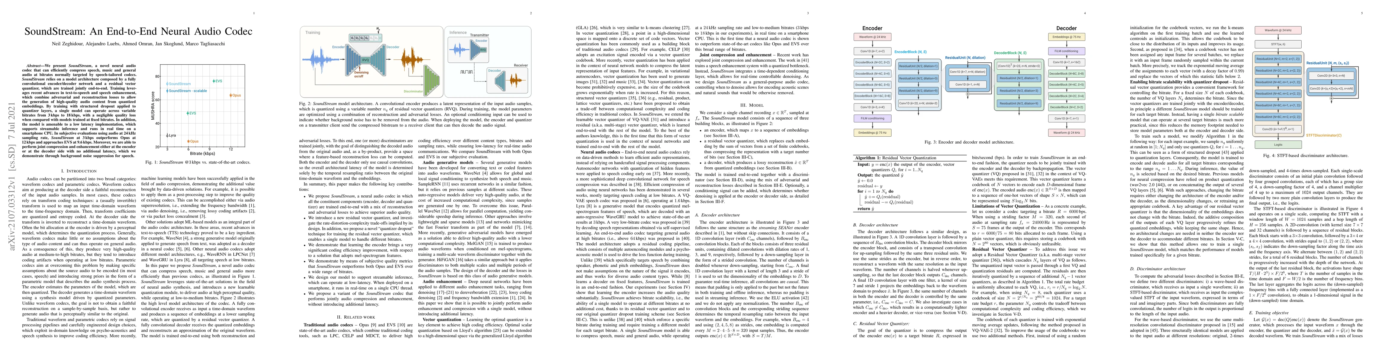 SoundStream is a neural audio codec that efficiently compresses speech, music, and general audio at low bitrates, achieving high-quality output comparable to speech-tailored codecs. It employs a fully convolutional encoder/decoder network and a residual vector quantizer, enabling operation across bitrates from 3kbps to 18kbps without significant quality loss.