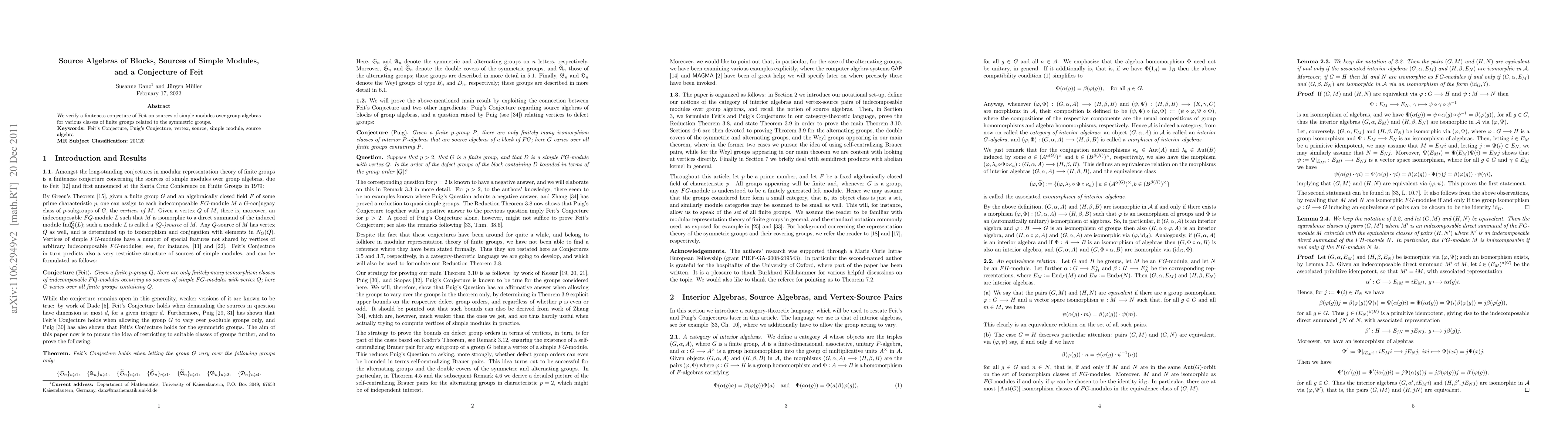 We verify a finiteness conjecture of Feit on sources of simple modules over group algebras for various classes of finite groups related to the symmetric groups.