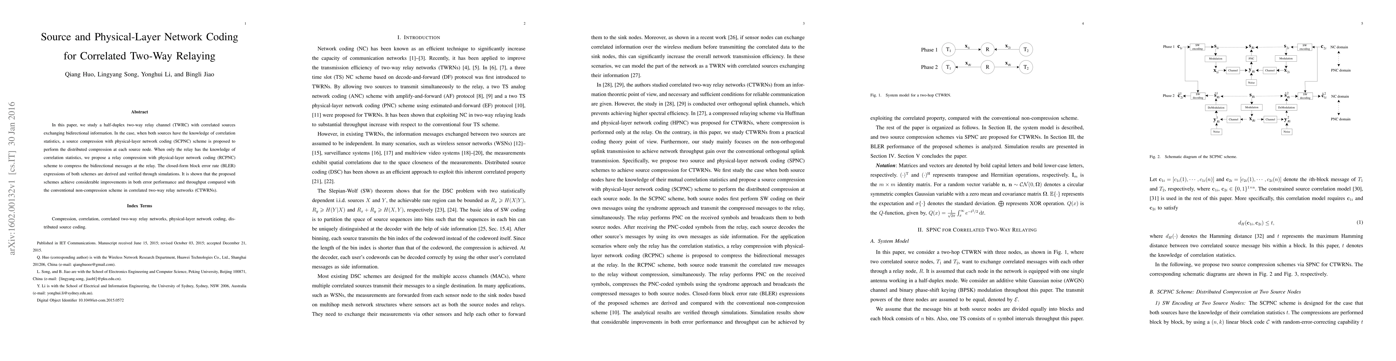 This paper proposes source and relay compression schemes using physical-layer network coding for correlated two-way relay channels. Both schemes significantly improve error performance and throughput compared to conventional methods, with SCPNC for source knowledge and RCPNC for relay knowledge of correlation statistics.