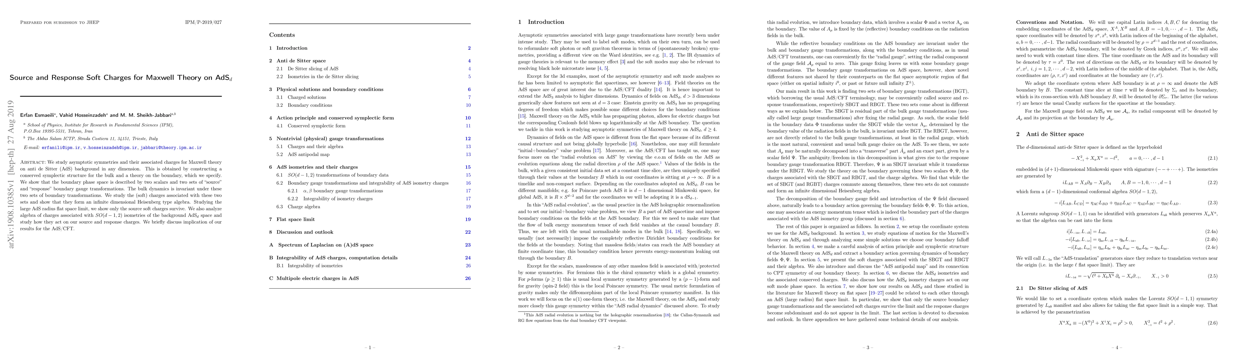 We study asymptotic symmetries and their associated charges for Maxwell theory on anti de Sitter (AdS) background in any dimension. This is obtained by constructing a conserved symplectic structure for the bulk and a theory on the boundary, which we specify. We show that the boundary phase space is described by two scalars and two sets of "source" and "response" boundary gauge transformations. The bulk dynamics is invariant under these two sets of boundary transformations. We study the (soft) charges associated with these two sets and show that they form an infinite dimensional Heisenberg type algebra. Studying the large AdS radius flat space limit, we show only the source soft charges survive. We also analyze algebra of charges associated with SO(d-1,2) isometries of the background $AdS_d$ space and study how they act on our source and response charges. We briefly discuss implication of our results for the AdS/CFT.