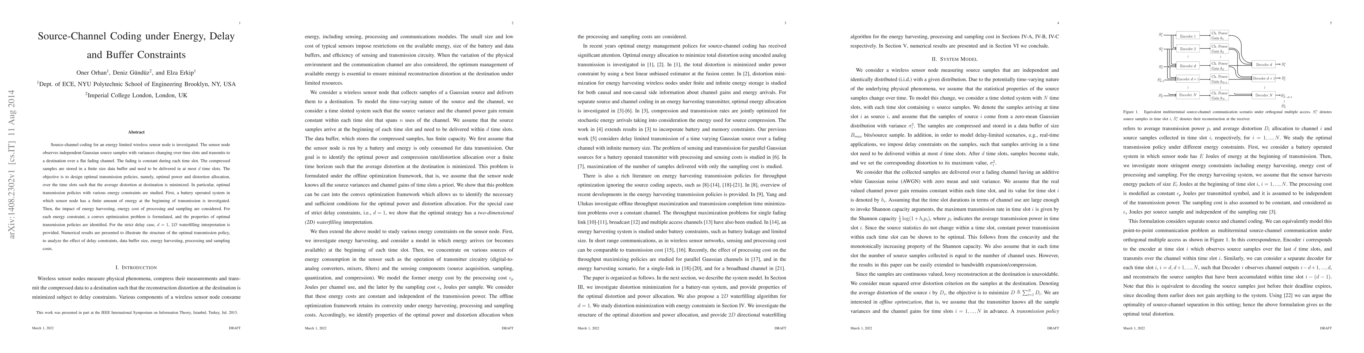 This paper explores source-channel coding strategies for energy-limited wireless sensor nodes under delay and buffer constraints, focusing on minimizing average distortion. It formulates convex optimization problems for various energy scenarios, including battery-operated and energy harvesting systems, and analyzes the impact of processing and sampling costs.