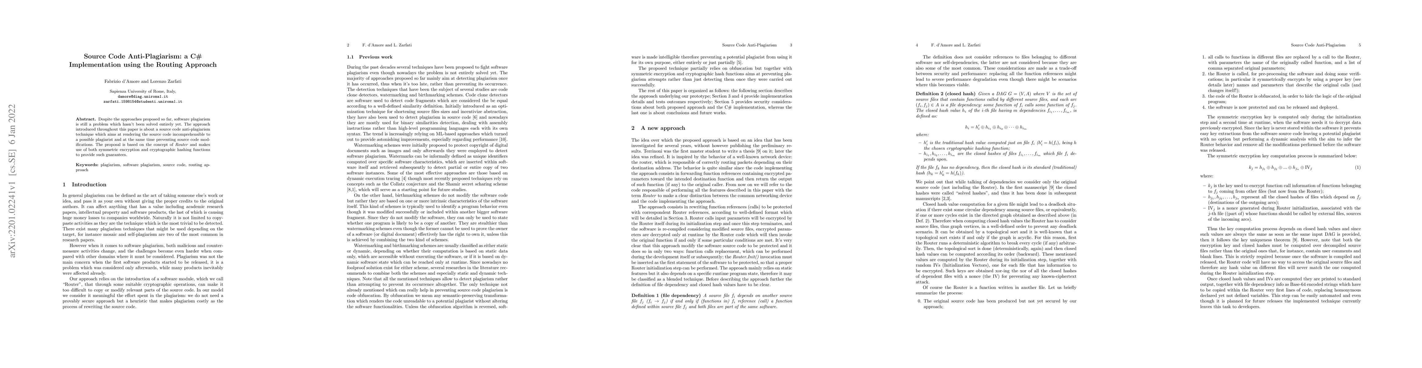 Despite the approaches proposed so far, software plagiarism is still a problem which has not been solved entirely yet. The approach introduced throughout this paper is about a source code anti-plagiarism technique which aims at rendering the source code incomprehensible to a possible plagiarist and at the same time preventing source code modifications. The proposal is based on the concept of Router and makes use of both symmetric encryption and cryptographic hashing functions to provide such guarantees.