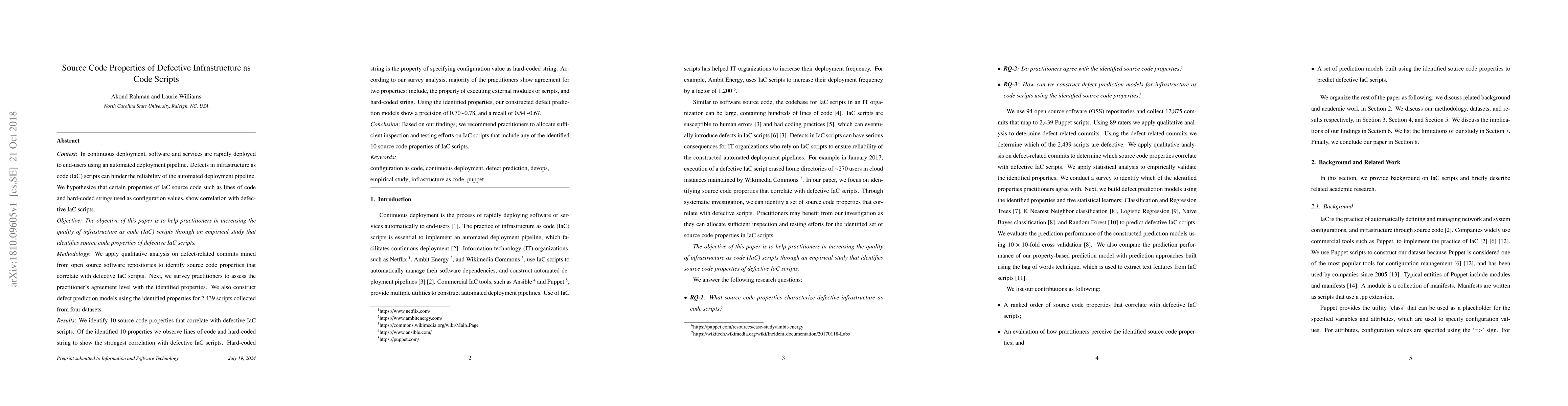 This paper investigates the source code properties of defective infrastructure as code (IaC) scripts, identifying 10 properties that correlate with defects, with lines of code and hard-coded strings showing the strongest correlation. The study also reports practitioner agreement on identified properties and constructs defect prediction models achieving precision of 0.70~0.78 and recall of 0.54~0.67.