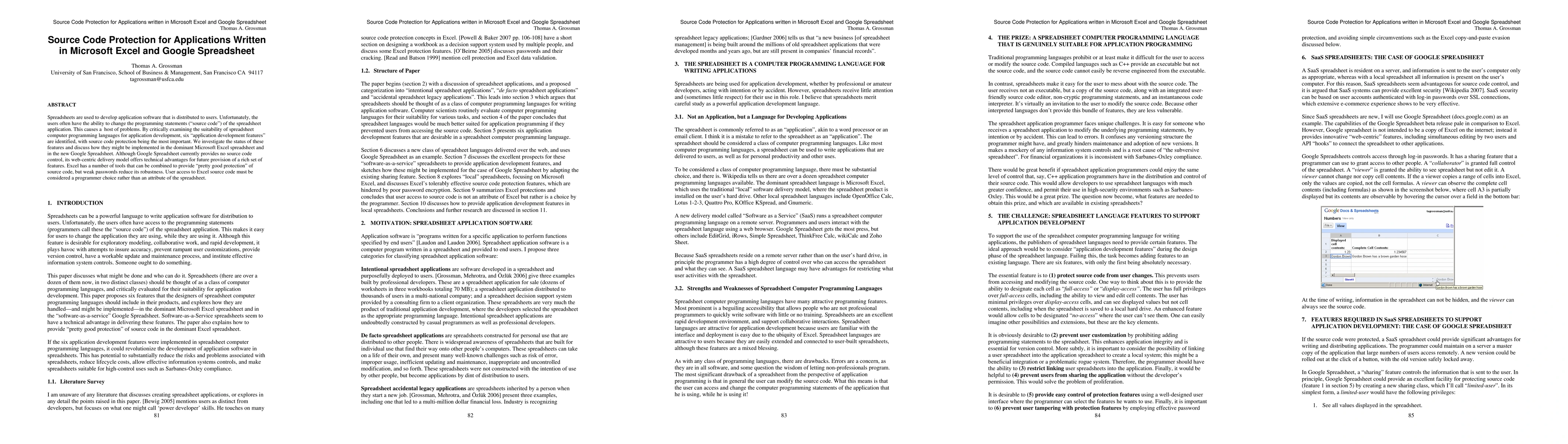 Spreadsheets are used to develop application software that is distributed to users. Unfortunately, the users often have the ability to change the programming statements ("source code") of the spreadsheet application. This causes a host of problems. By critically examining the suitability of spreadsheet computer programming languages for application development, six "application development features" are identified, with source code protection being the most important. We investigate the status of these features and discuss how they might be implemented in the dominant Microsoft Excel spreadsheet and in the new Google Spreadsheet. Although Google Spreadsheet currently provides no source code control, its web-centric delivery model offers technical advantages for future provision of a rich set of features. Excel has a number of tools that can be combined to provide "pretty good protection" of source code, but weak passwords reduce its robustness. User access to Excel source code must be considered a programmer choice rather than an attribute of the spreadsheet.