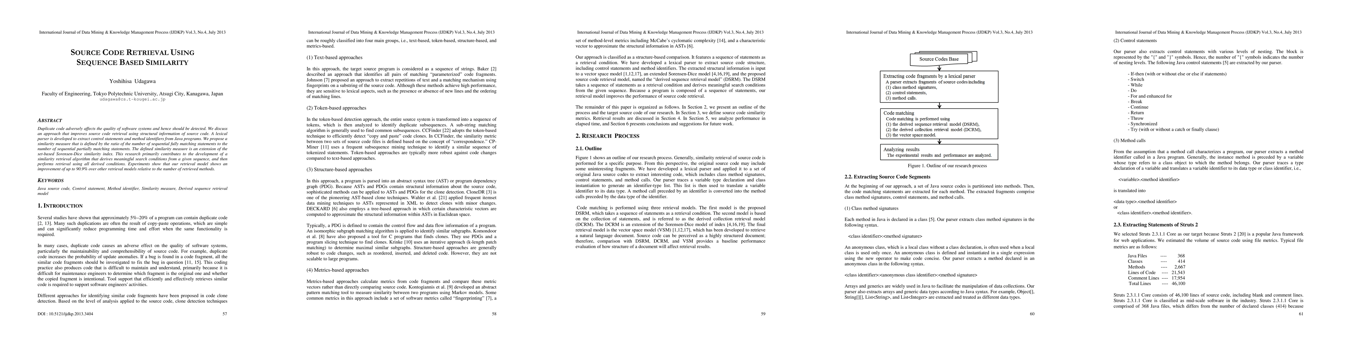 Duplicated code has a negative impact on the quality of software systems and should be detected at least. In this paper, we discuss an approach that improves source code retrieval using the structural information about the programs. We developed a lexical parser to extract control statements and method identifiers from Java programs. We propose a similarity measure that is defined by the ratio of the number of sequentially full matching statements to the number of sequentially partial matching ones. The similarity measure is considered to be an extension of a set based similarity index, e.g., Sorensen-Dice index. Our key contribution of this research is the development of a similarity retrieval algorithm that derives meaningful search conditions from a given sequence, and then performs retrieval using all of the derived conditions. Experiments show that our retrieval model outperforms the other retrieval models up to 90.9% in the number of retrieved methods.