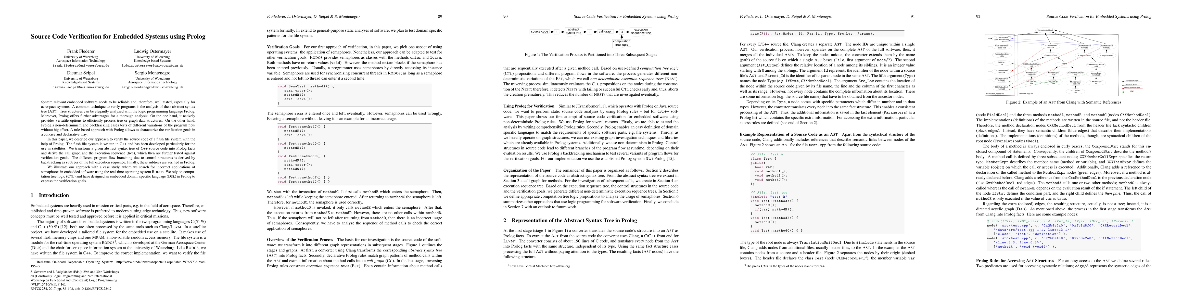 This paper presents a method for verifying embedded systems software using Prolog to analyze the abstract syntax tree (AST). The authors apply Prolog's capabilities to transform C++ source code into Prolog facts, derive execution sequences, and test these sequences against verification goals, illustrated by a case study detecting incorrect semaphore usage in satellite software.