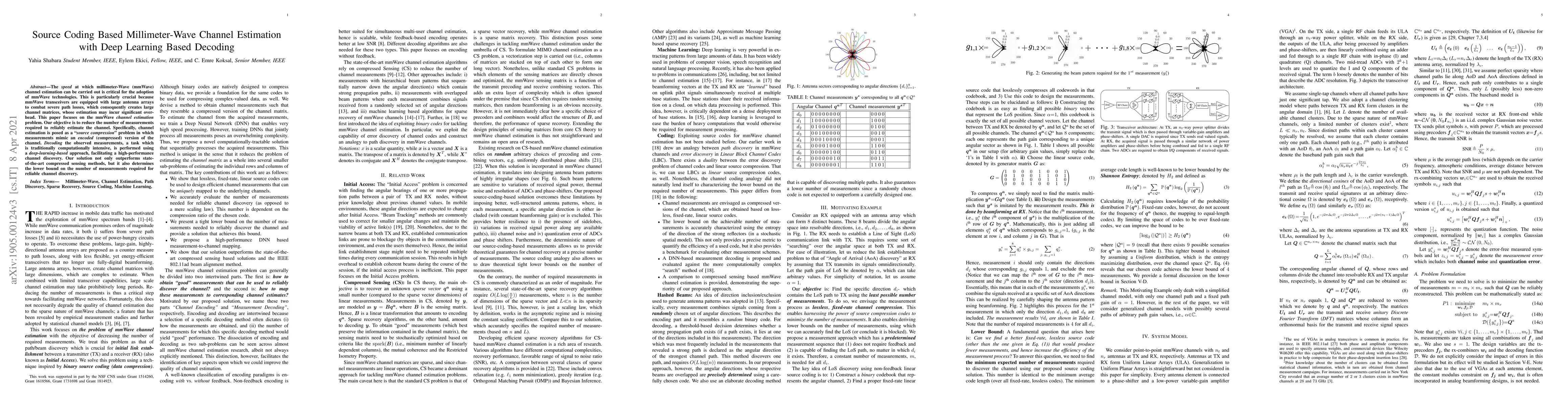 This paper proposes a new method for estimating millimeter-wave channels using source coding and deep learning-based decoding, reducing the number of measurements required for reliable channel discovery. It outperforms existing compressed sensing methods and determines the lower bound on measurements needed.