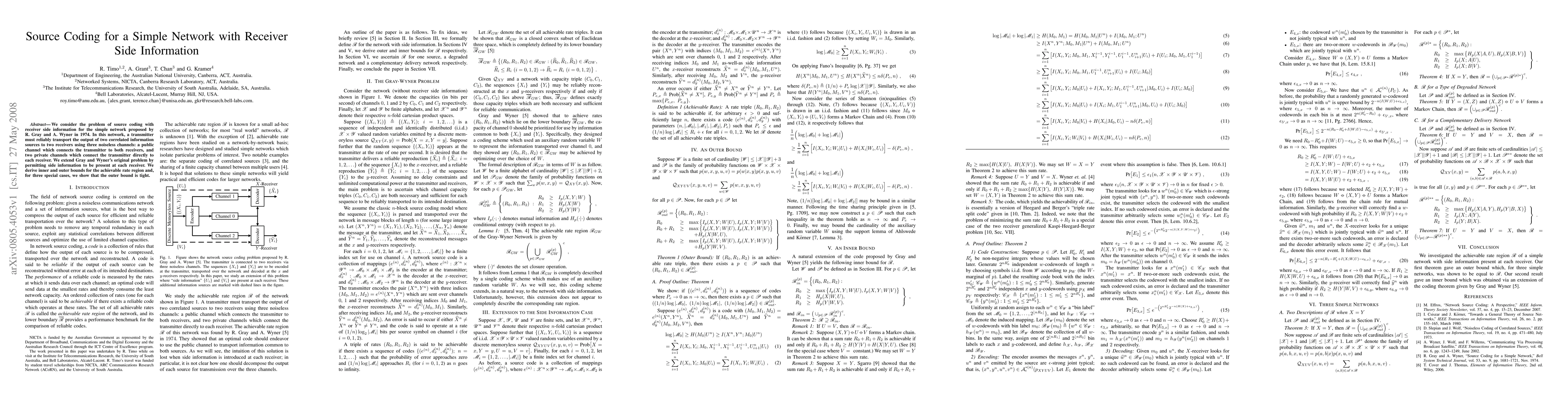 This paper investigates source coding for a network with two correlated information sources and two receivers, allowing each receiver to use side information. It derives inner and outer bounds for the achievable rate region and demonstrates tightness for specific cases.