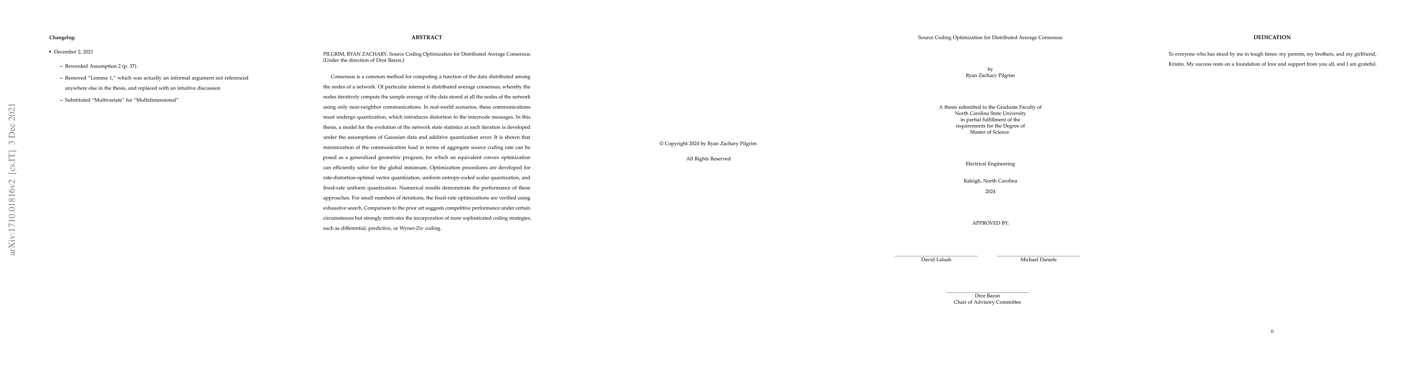 Consensus is a common method for computing a function of the data distributed among the nodes of a network. Of particular interest is distributed average consensus, whereby the nodes iteratively compute the sample average of the data stored at all the nodes of the network using only near-neighbor communications. In real-world scenarios, these communications must undergo quantization, which introduces distortion to the internode messages. In this thesis, a model for the evolution of the network state statistics at each iteration is developed under the assumptions of Gaussian data and additive quantization error. It is shown that minimization of the communication load in terms of aggregate source coding rate can be posed as a generalized geometric program, for which an equivalent convex optimization can efficiently solve for the global minimum. Optimization procedures are developed for rate-distortion-optimal vector quantization, uniform entropy-coded scalar quantization, and fixed-rate uniform quantization. Numerical results demonstrate the performance of these approaches. For small numbers of iterations, the fixed-rate optimizations are verified using exhaustive search. Comparison to the prior art suggests competitive performance under certain circumstances but strongly motivates the incorporation of more sophisticated coding strategies, such as differential, predictive, or Wyner-Ziv coding.