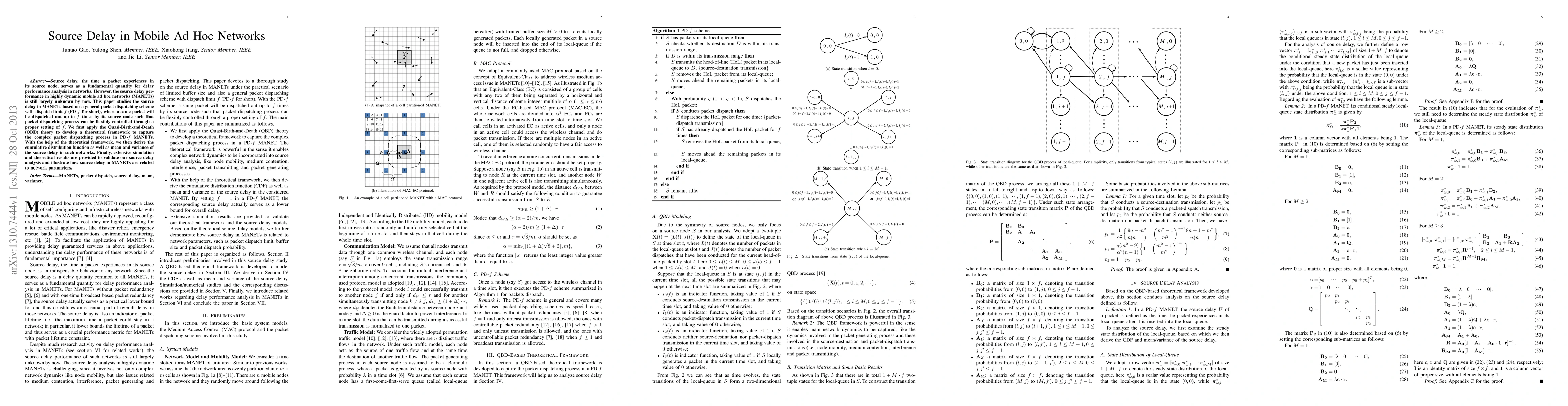 This paper investigates the source delay in mobile ad hoc networks (MANETs) using a packet dispatching scheme with a dispatch limit, PD-$f$. It develops a theoretical framework based on the Quasi-Birth-and-Death theory to analyze the source delay, deriving its cumulative distribution function, mean, and variance, and validating the findings through simulations.