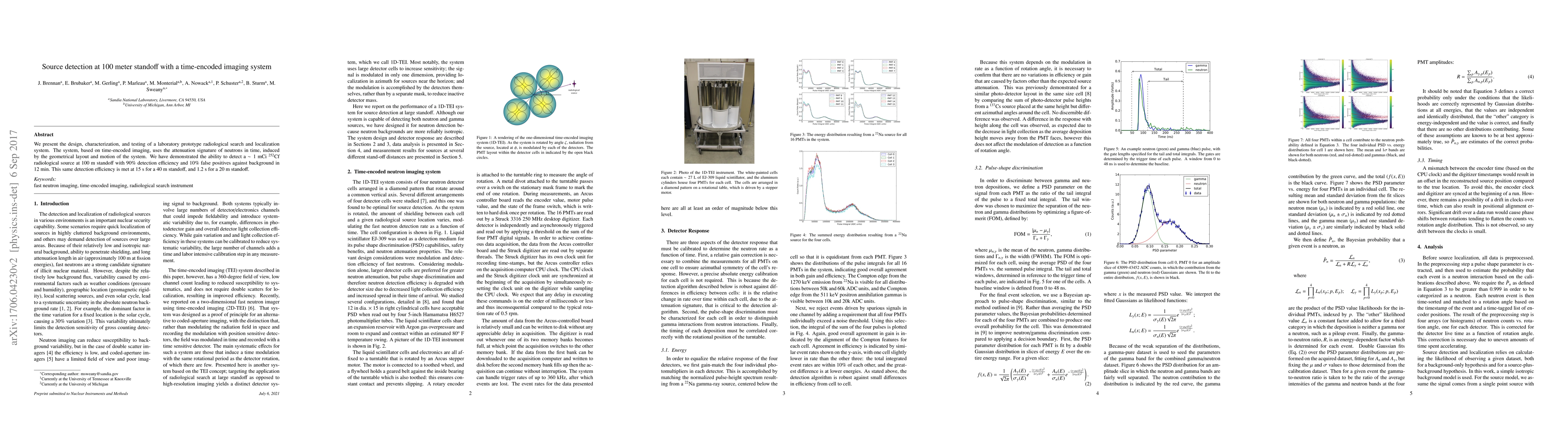 We present the design, characterization, and testing of a laboratory prototype radiological search and localization system. The system, based on time-encoded imaging, uses the attenuation signature of neutrons in time, induced by the geometrical layout and motion of the system. We have demonstrated the ability to detect a ~1 mCi Cf-252 radiological source at 100 m standoff with 90% detection efficiency and 10% false positives against background in 12 min. This same detection efficiency is met at 15 s for a 40 m standoff, and 1.2 s for a 20 m standoff.
