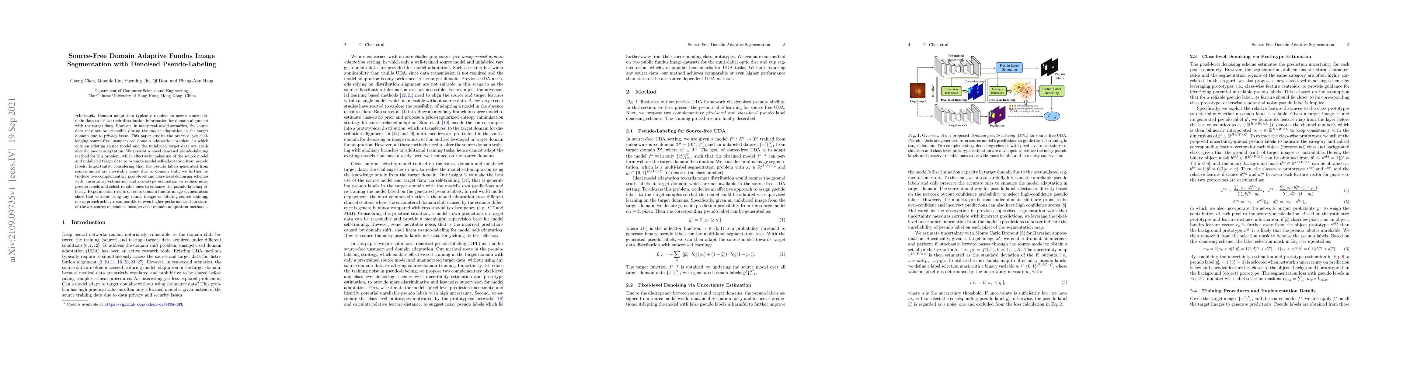 This paper proposes a novel source-free domain adaptive method for fundus image segmentation using denoised pseudo-labeling. It leverages an existing source model and unlabeled target data to generate and refine pseudo labels, employing pixel-level and class-level denoising techniques to improve segmentation performance without accessing source data.