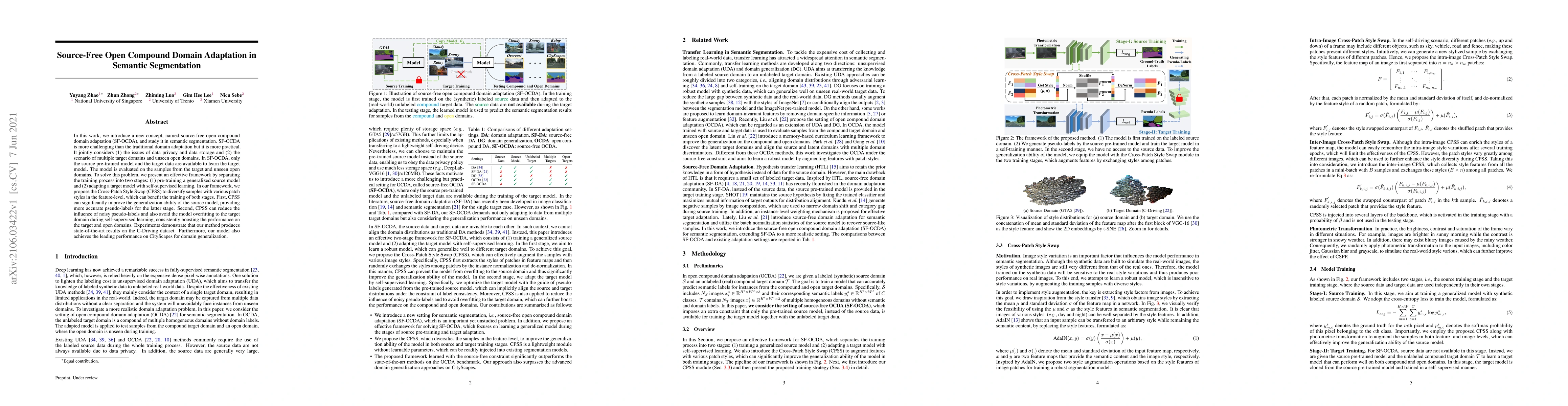 This paper introduces source-free open compound domain adaptation (SF-OCDA) for semantic segmentation, addressing data privacy and multiple target domains without source data access. The proposed Cross-Patch Style Swap (CPSS) framework enhances generalization and reduces overfitting, achieving state-of-the-art results on C-Driving and CityScapes datasets.