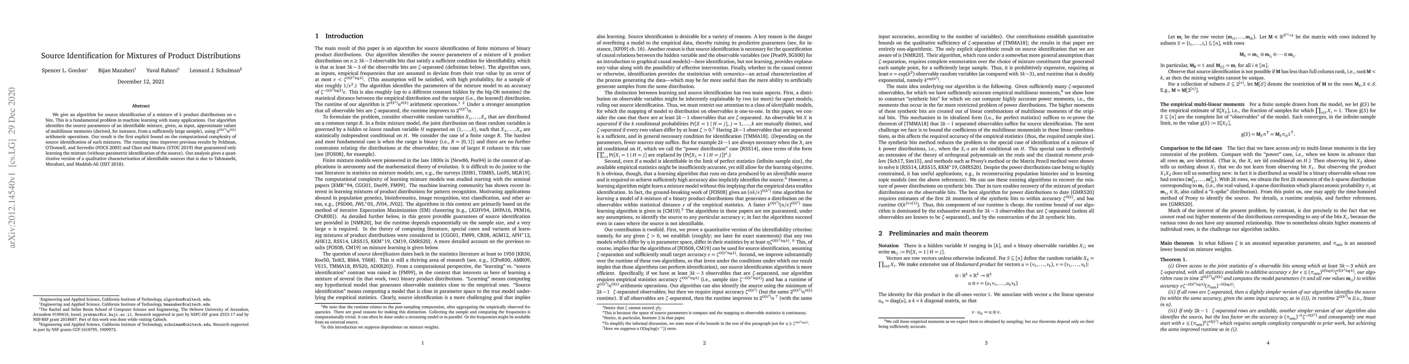We give an algorithm for source identification of a mixture of $k$ product distributions on $n$ bits. This is a fundamental problem in machine learning with many applications. Our algorithm identifies the source parameters of an identifiable mixture, given, as input, approximate values of multilinear moments (derived, for instance, from a sufficiently large sample), using $2^{O(k^2)} n^{O(k)}$ arithmetic operations. Our result is the first explicit bound on the computational complexity of source identification of such mixtures. The running time improves previous results by Feldman, O'Donnell, and Servedio (FOCS 2005) and Chen and Moitra (STOC 2019) that guaranteed only learning the mixture (without parametric identification of the source). Our analysis gives a quantitative version of a qualitative characterization of identifiable sources that is due to Tahmasebi, Motahari, and Maddah-Ali (ISIT 2018).