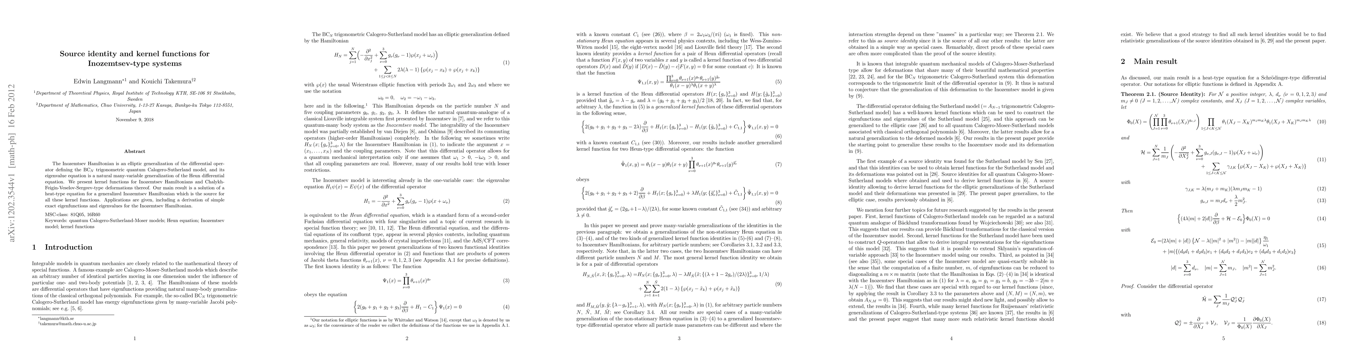 The Inozemtsev Hamiltonian is an elliptic generalization of the differential operator defining the BC_N trigonometric quantum Calogero-Sutherland model, and its eigenvalue equation is a natural many-variable generalization of the Heun differential equation. We present kernel functions for Inozemtsev Hamiltonians and Chalykh-Feigin-Veselov-Sergeev-type deformations thereof. Our main result is a solution of a heat-type equation for a generalized Inozemtsev Hamiltonian which is the source for all these kernel functions. Applications are given, including a derivation of simple exact eigenfunctions and eigenvalues for the Inozemtsev Hamiltonian.