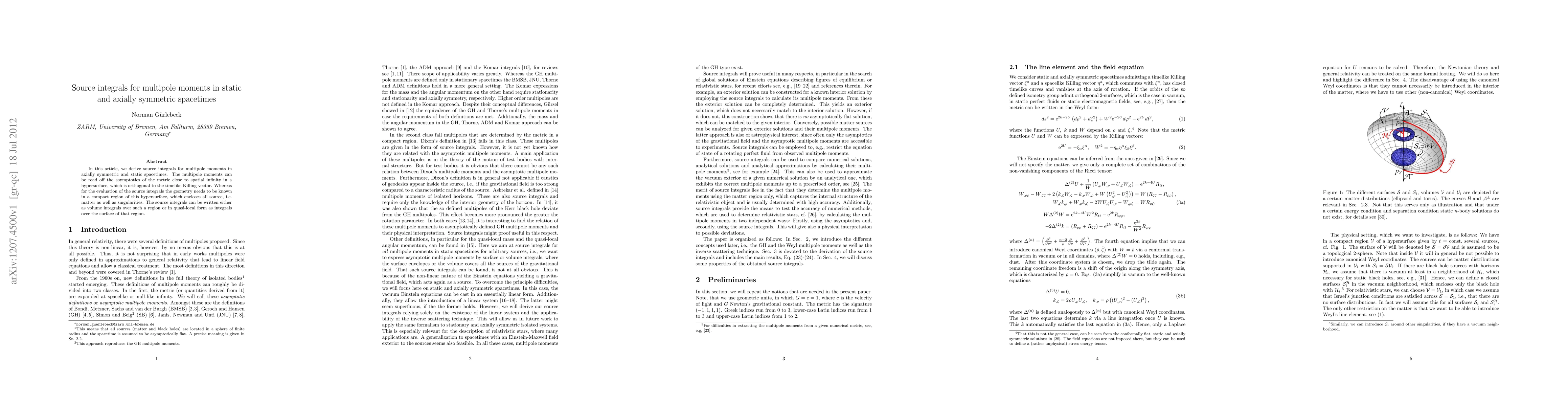 This paper derives source integrals for multipole moments in axially symmetric and static spacetimes, enabling the extraction of multipole moments from the metric's asymptotic behavior near spatial infinity. The integrals can be expressed as either volume integrals over a compact region or quasi-local surface integrals.