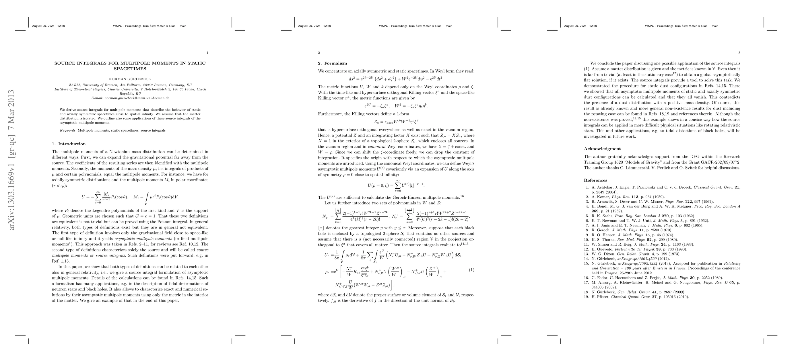 This paper derives source integrals for multipole moments to describe the behavior of static, axially symmetric spacetimes near infinity, assuming an isolated matter distribution, and discusses potential applications of these integrals in the study of asymptotic multipole moments.